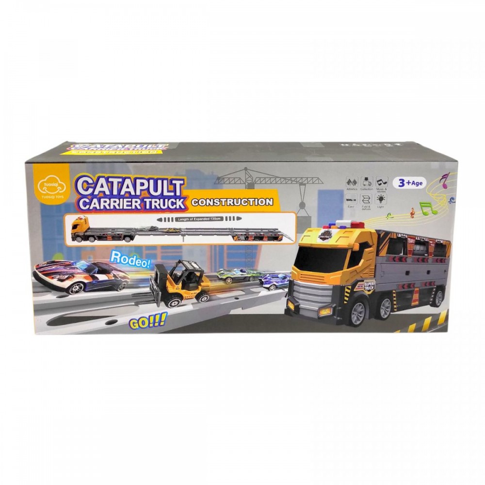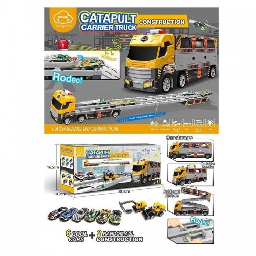 Интернет-магазин eToys предлагает вашему вниманию товар "Трейлер-трек "Строительная спецтехника" размер 38х10.5х15 см, длина трека 135 см, механический запусник, подсветка, звук, 2 металлопластиковые модели, 6 пластиковых моделей, в коробке" по цене 881 грн..