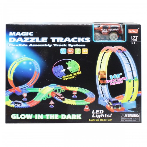 Трек с машинкой. В набор входят детали для трека и петель, препятствия на дороге, наклейки и машинка. Части трека легко соединяются, их можно комбинировать в любых последовательностях. Машинка работает на батарейках, включается с помощью кнопки. Сделано из пластика. Трек светится в темноте. Длина трека 3м.