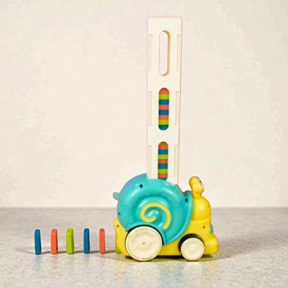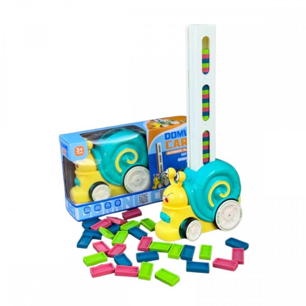 Игрушка-машинка в виде миленького зверька развозящего костяшки. Улитка поможет расставить домино в заданном пути. На каждую маленькую плитку можно наклеить специальные наклейки с различными цифрами и символами, которые машинка развезет и создаст интересные примеры. С этой игрушкой ребенок научится лучше считать. В комплекте присутствует фигурка кактуса.