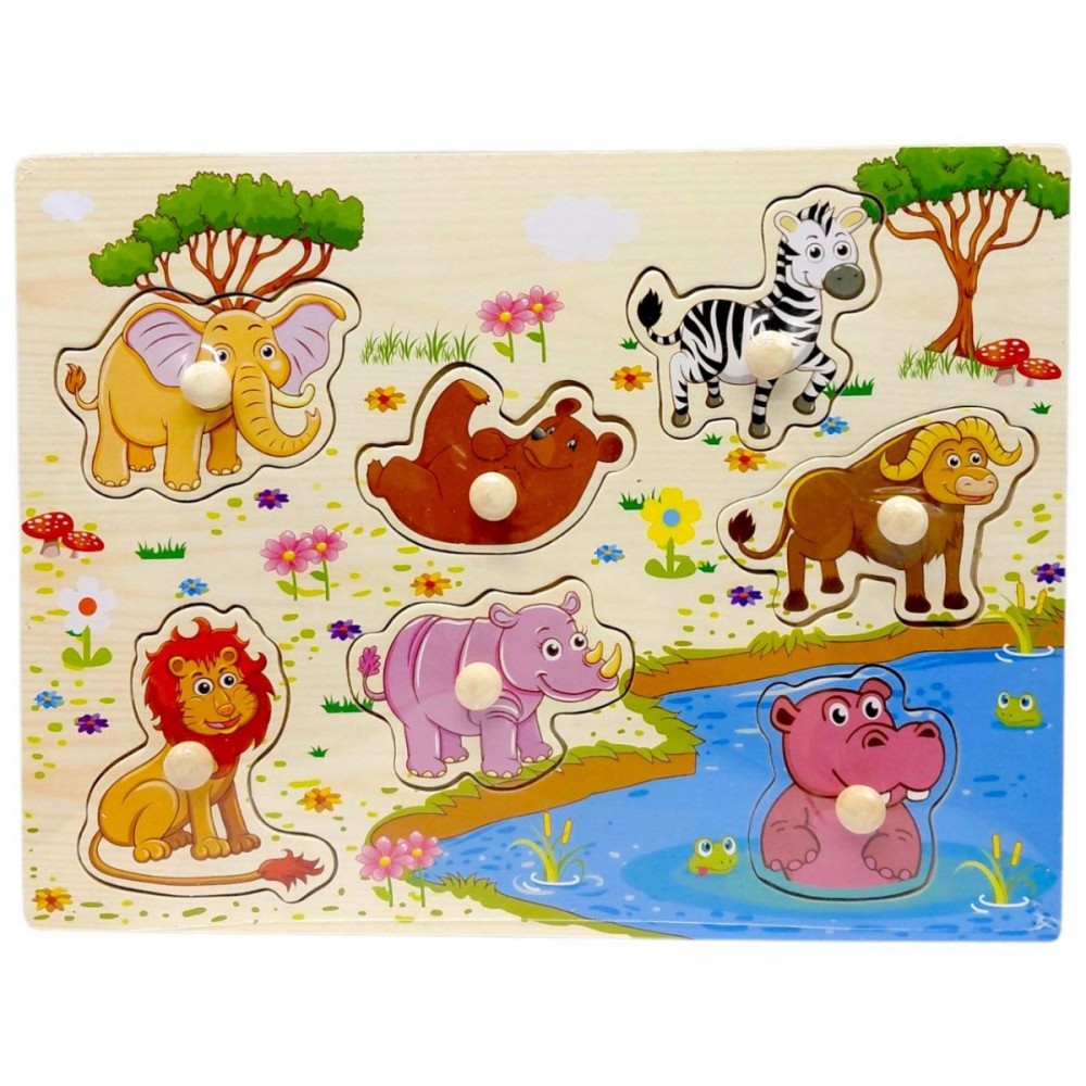 Деревянная рамка-вкладыш с тематикой "Животные" создана для развития моторики, мышления и зрительного восприятия у детей. На основе изображена яркая сюжетная сцена с разными видами фигурок, а каждый элемент нужно правильно вставить в соответствующее отверстие.