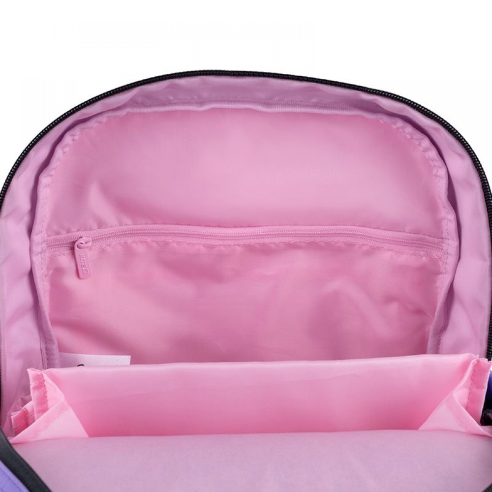 Рюкзак зовні: запатентована ортопедична спинка Ergo Kids; широкі S-подібні лямки; 2 відділення; 1 передня кишеня на блискавці, 2 накладні кишені: одна на блискавці, інша з клапаном на фастексі; 2 бічні кишені; світловідбивні елементи; ручка з гумовою вставкою; знімний нагрудний ремінь; ущільнене дно з захисним покриттям; зносостійкі блискавки, надійна фурнітура. Рюкзак всередині: роздільники з фіксуючою резинкою; кишеня для телефона з плюшевою підкладкою; органайзер; знімна ключниця; брендована підкладка; поле для персональних даних. Декор: поліестер з жатим ефектом, вишивка, об'ємний друк, задрукована тасьма, прозора кишеня з помпонами, кишеня з м'якої та фактурної тканини букле, декоративний ланцюжок