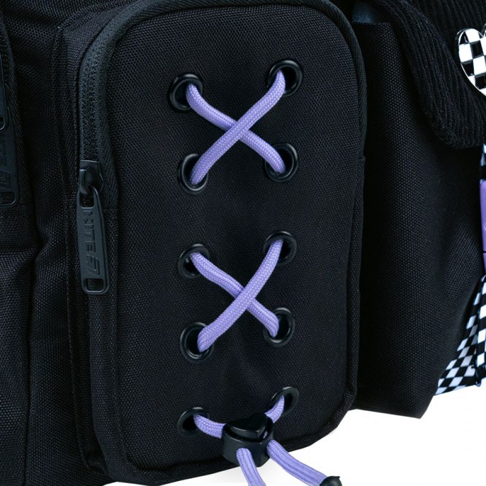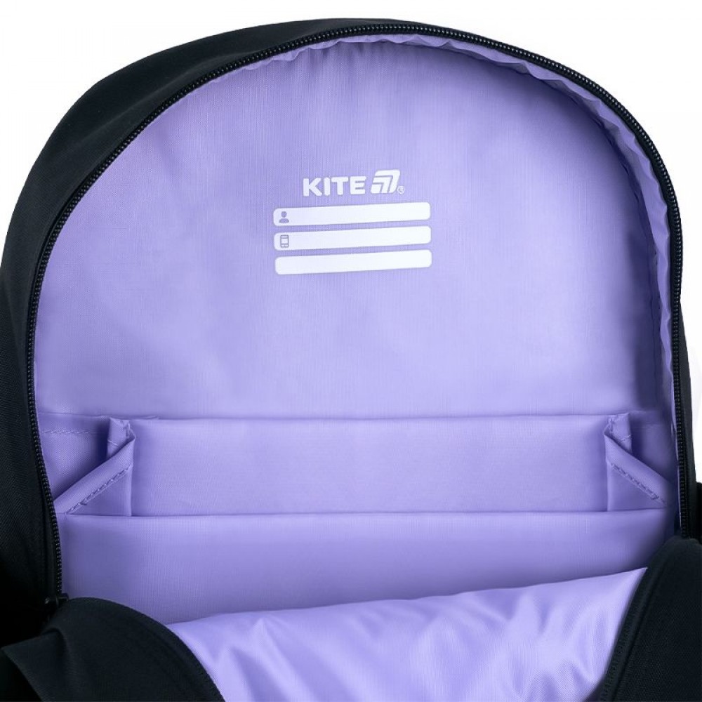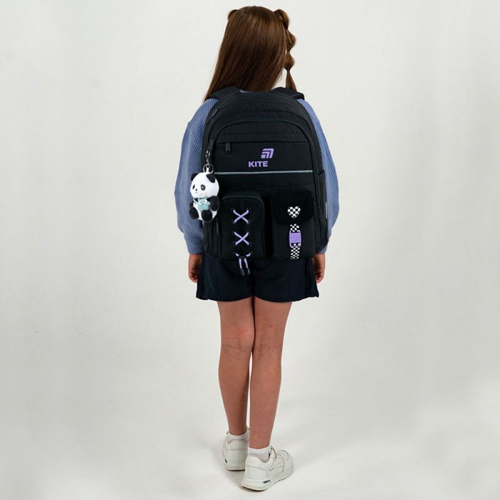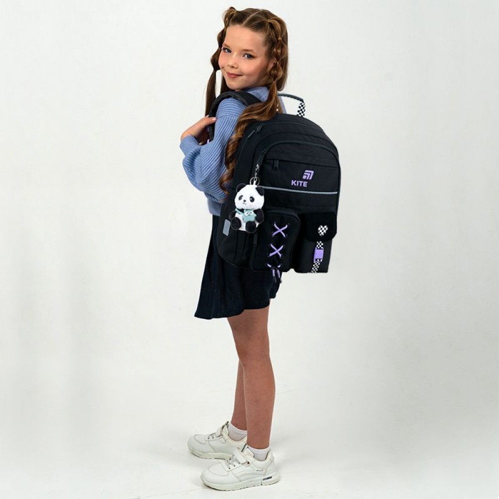 Рюкзак зовні: запатентована ортопедична спинка Ergo Kids; широкі S-подібні лямки; 2 відділення; 1 передня кишеня на блискавці, 2 накладні кишені: одна на блискавці, інша з клапаном на фастексі; 2 бічні кишені; світловідбивні елементи; ручка з гумовою вставкою; знімний нагрудний ремінь; ущільнене дно з захисним покриттям; зносостійкі блискавки, надійна фурнітура. Рюкзак всередині: роздільники з фіксуючою резинкою; кишеня для телефона з плюшевою підкладкою; органайзер; знімна ключниця; брендована підкладка; поле для персональних даних. Декор: об'ємний друк, задрукована тасьма, шнурівка, металевий значок, клапан кишені з вельветової тканини, декоративна іграшка-брелок з металевим карабіном