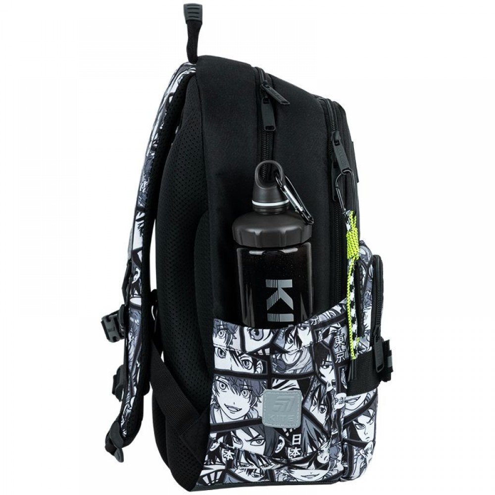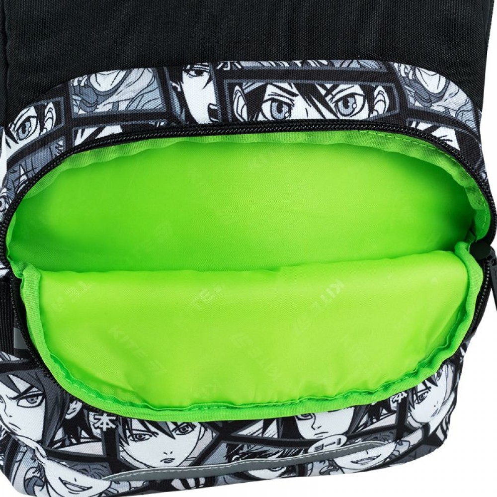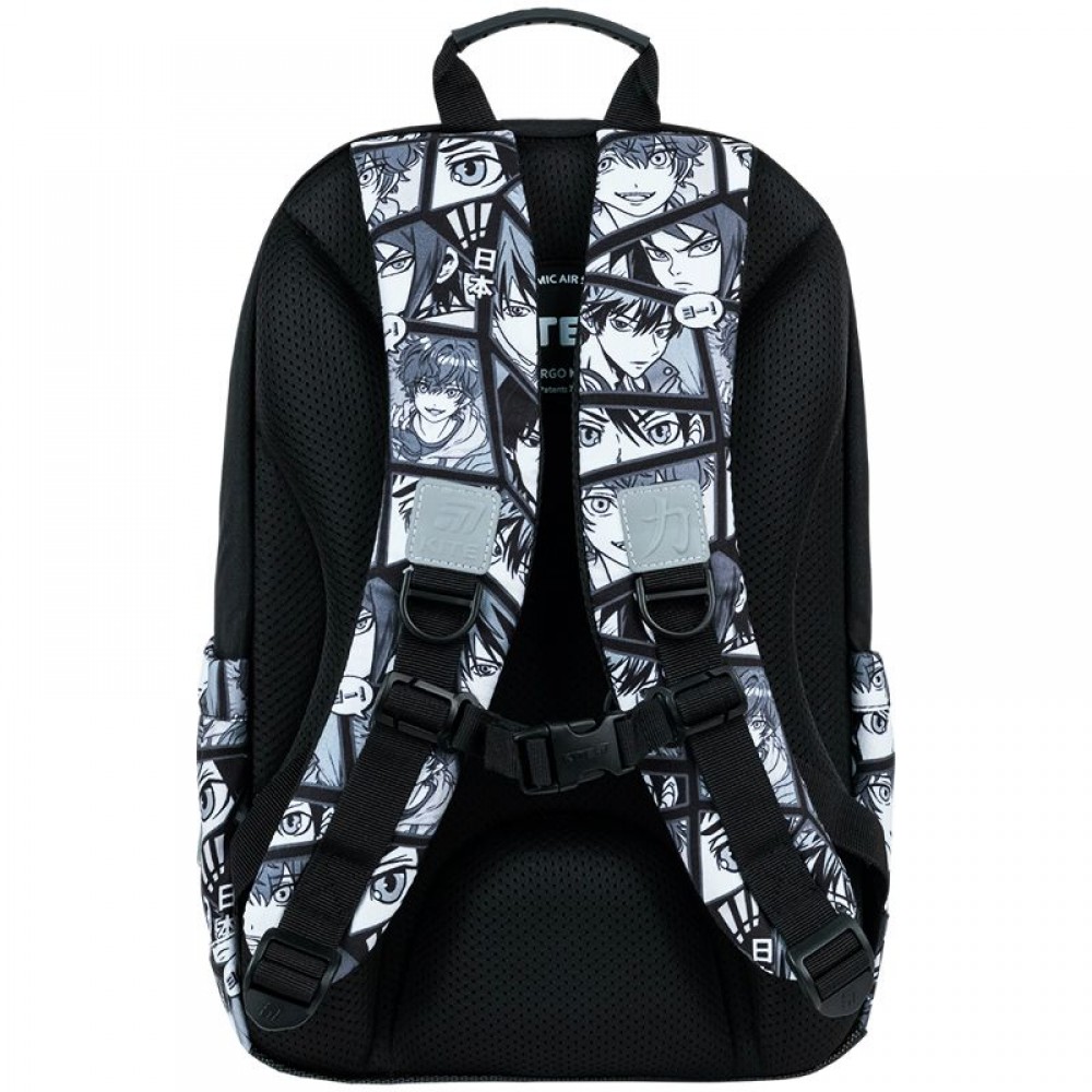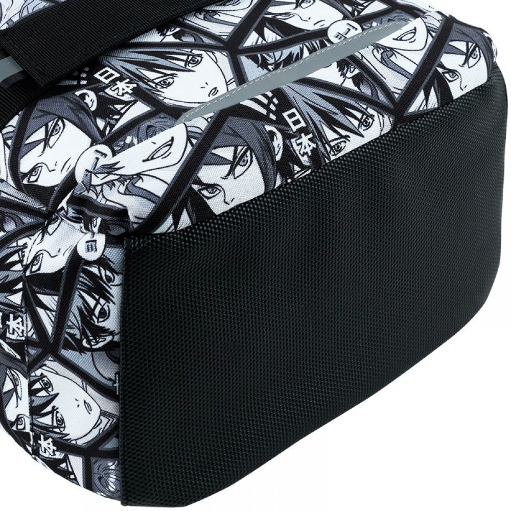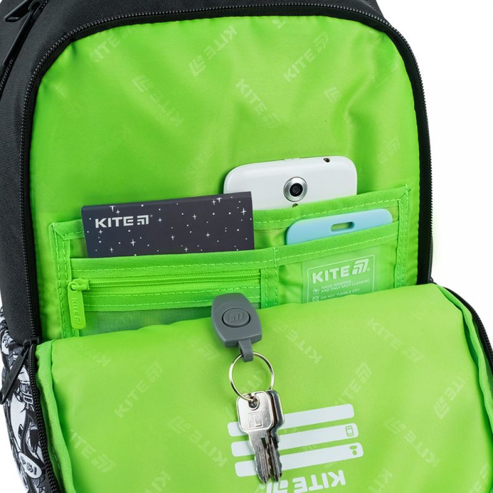 Рюкзак зовні: запатентована ортопедична спинка Ergo Kids; широкі S-подібні лямки; 2 відділення; 1 об'ємна передня кишеня; 2 бічні кишені; світловідбивні елементи; ручка з гумовою вставкою; знімний нагрудний ремінь; ущільнене дно з захисним покриттям; зносостійкі блискавки, надійна фурнітура. Рюкзак всередині: роздільники з фіксуючою резинкою; кишеня для телефона з плюшевою підкладкою; органайзер; знімна ключниця; брендована підкладка; поле для персональних даних. Декор: сублімаційний друк, металеві люверси, брелок-підвіска з комбінованих матеріалів.