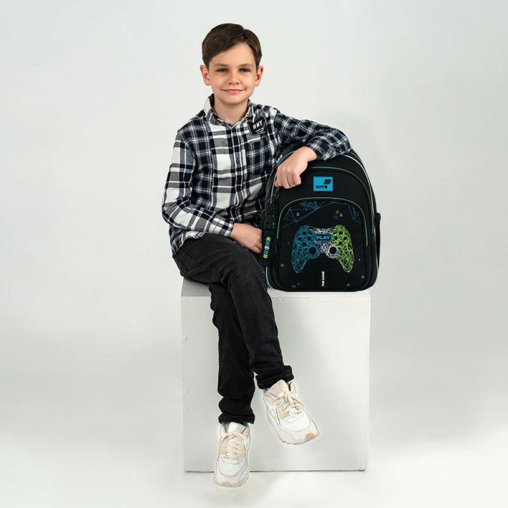 Рюкзак зовні: запатентована ортопедична спинка Ergo Kids; широкі S-подібні лямки; 2 відділення; 1 об'ємна передня кишеня; 2 бічні кишені; світловідбивні елементи; м'яка ущільнена ручка та текстильна петля; знімний нагрудний ремінь; ущільнене дно з захисним покриттям; зносостійкі блискавки, надійна фурнітура. Рюкзак всередині: роздільники з фіксуючою резинкою; кишеня для телефона з плюшевою підкладкою; органайзер; знімна ключниця; брендована підкладка; поле для персональних даних. Декор: об'ємний друк, друк на тасьмі, гумовий бейдж, брелок-підвіска з комбінованих матеріалів