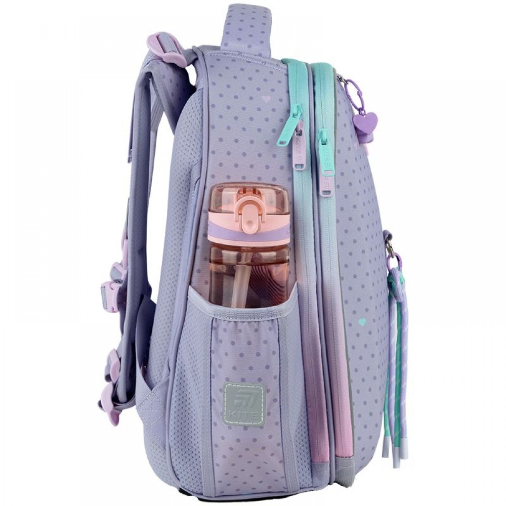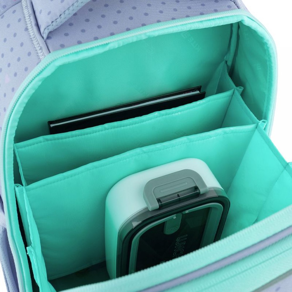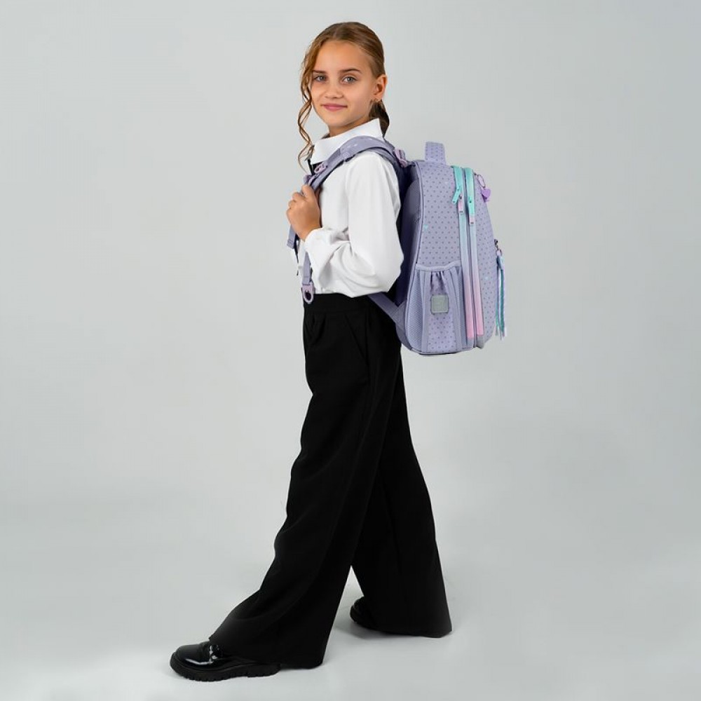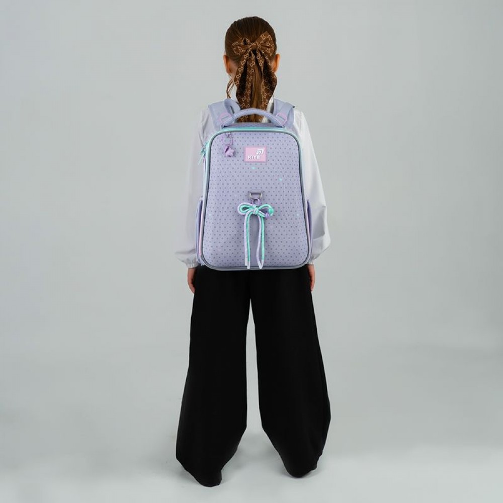 Рюкзак зовні: запатентована ортопедична спинка Ergo Kids; система регулювання спинки під зріст дитини; широкі S-подібні лямки; 2 відділення; 2 бічні кишені; світловідбивні елементи; м'яка ущільнена ручка та текстильна петля; знімний нагрудний ремінь; ущільнене дно з захисним покриттям та ніжками; зносостійкі блискавки, надійна фурнітура. Рюкзак всередині: роздільники; кишеня для телефона з плюшевою підкладкою; внутрішня кишеня на резинці; органайзер; знімна ключниця; брендована підкладка; поле для персональних даних. Декор: сублімаційний друк, підвіска з комбінованих матеріалів, брелок-підвіска з паракорду у формі бантика.