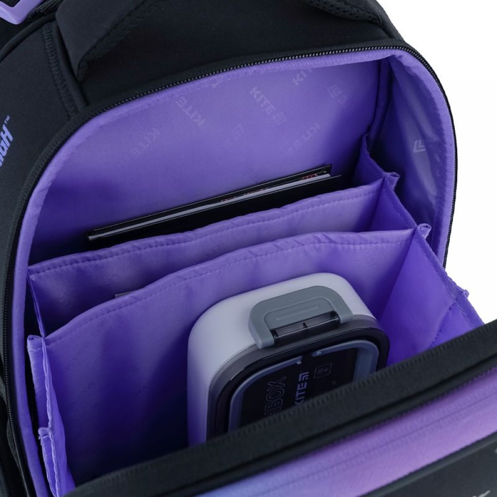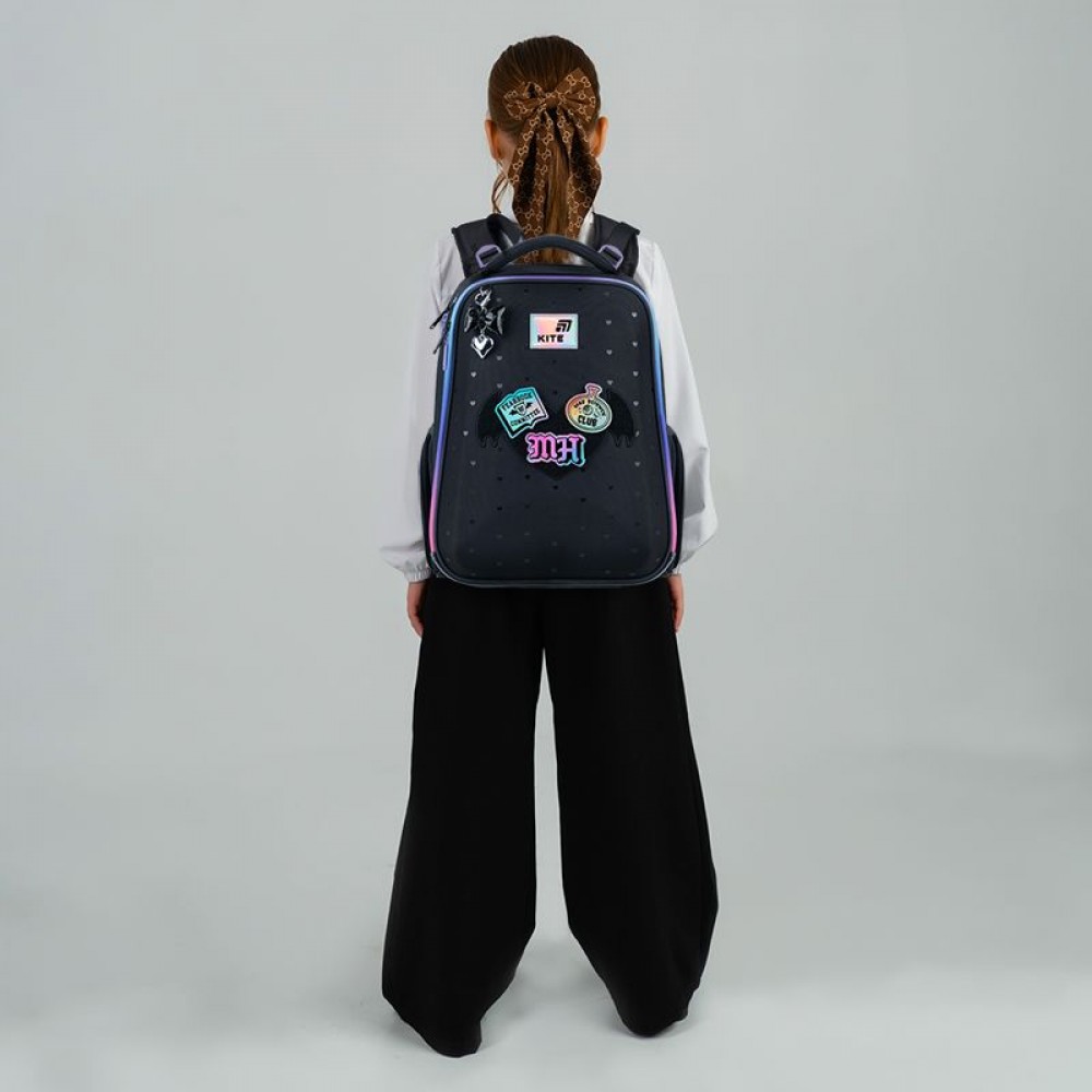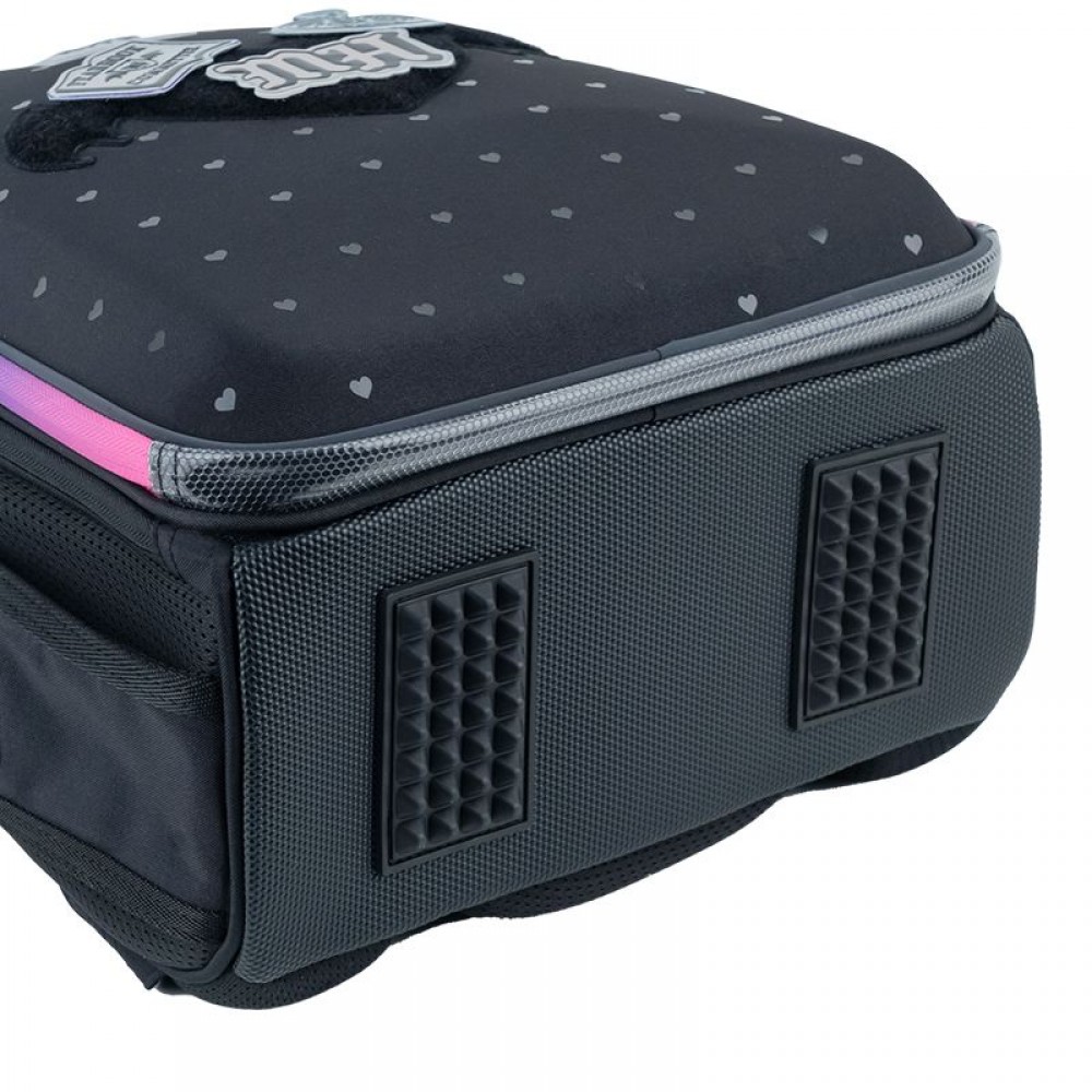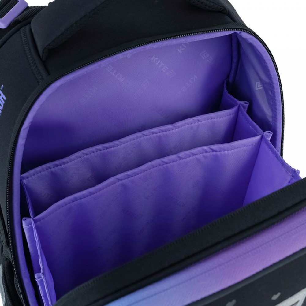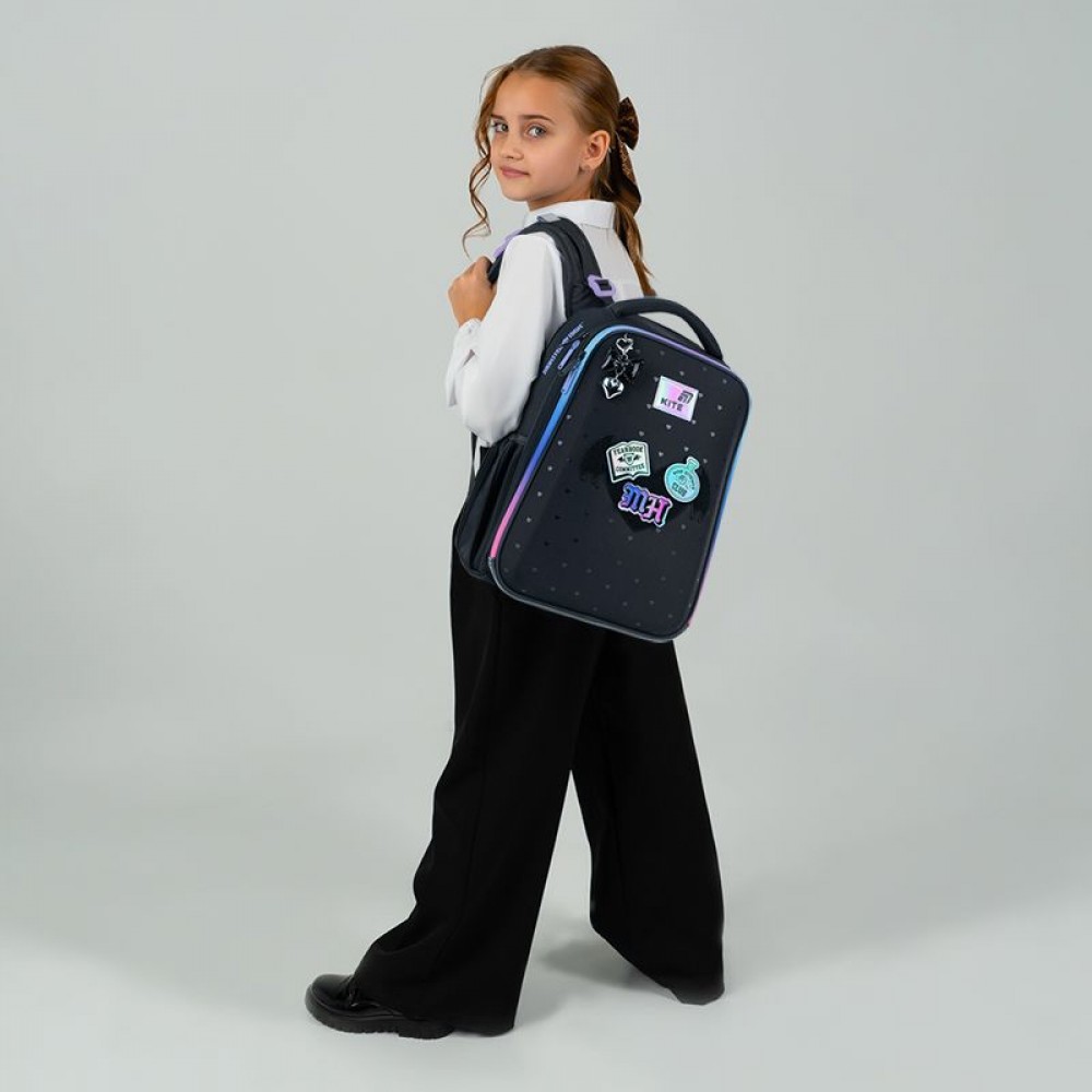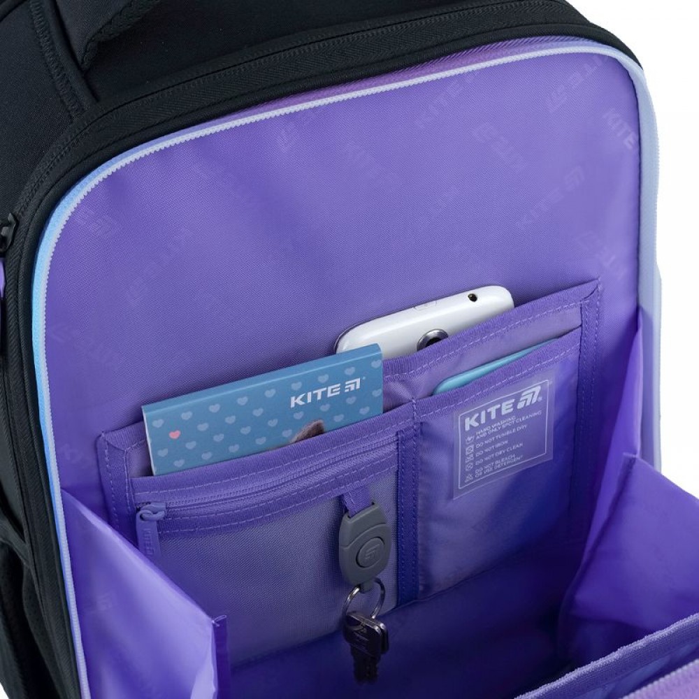 Рюкзак зовні: запатентована ортопедична спинка Ergo Kids; система регулювання спинки під зріст дитини; широкі S-подібні лямки; 2 відділення; 2 бічні кишені; світловідбивні елементи; м'яка ущільнена ручка та текстильна петля; знімний нагрудний ремінь; ущільнене дно з захисним покриттям та ніжками; зносостійкі блискавки, надійна фурнітура. Рюкзак всередині: роздільники; кишеня для телефона з плюшевою підкладкою; внутрішня кишеня на резинці; органайзер; знімна ключниця; брендована підкладка; поле для персональних даних. Декор: об'ємний друк, м'яка нашивка з липучки, гумові бейджі на липучці, брелок-підвіска з комбінованих матеріалів.
