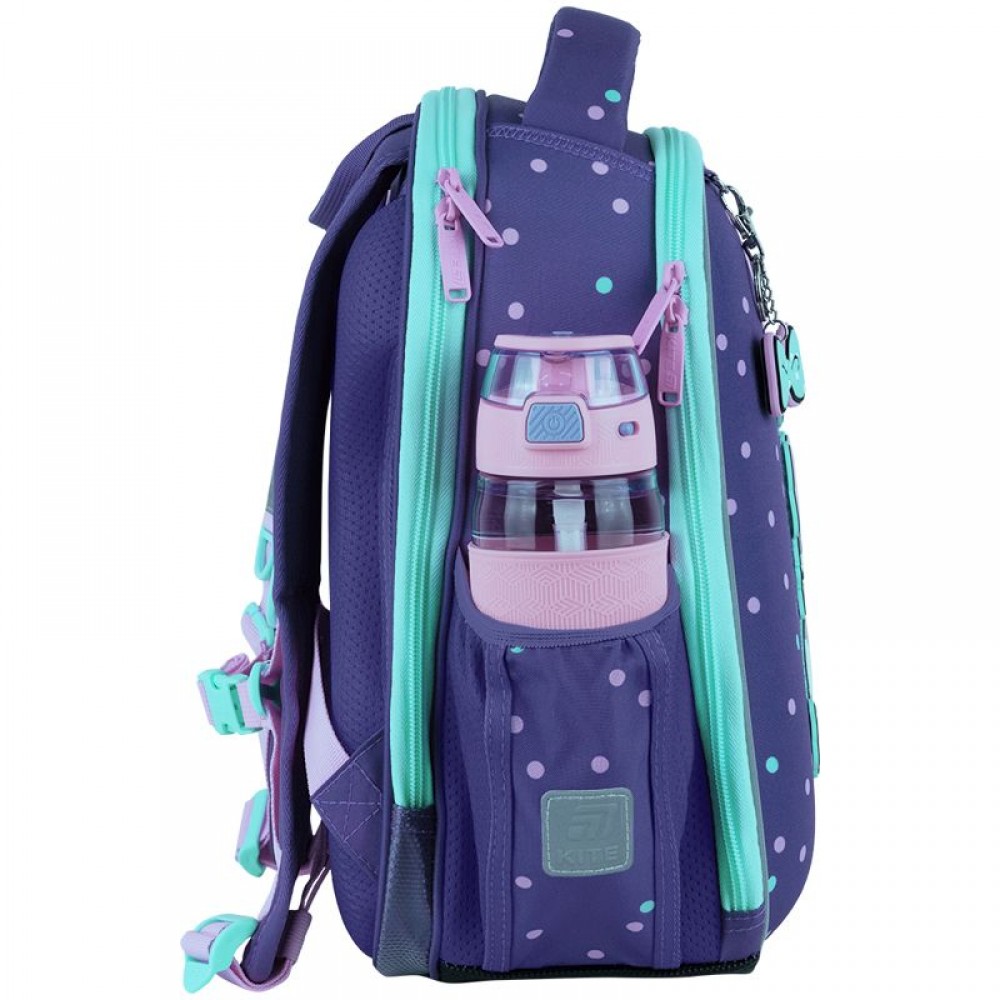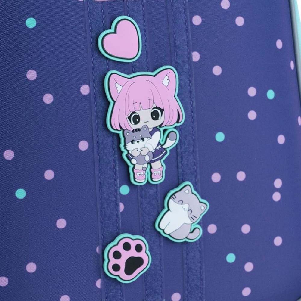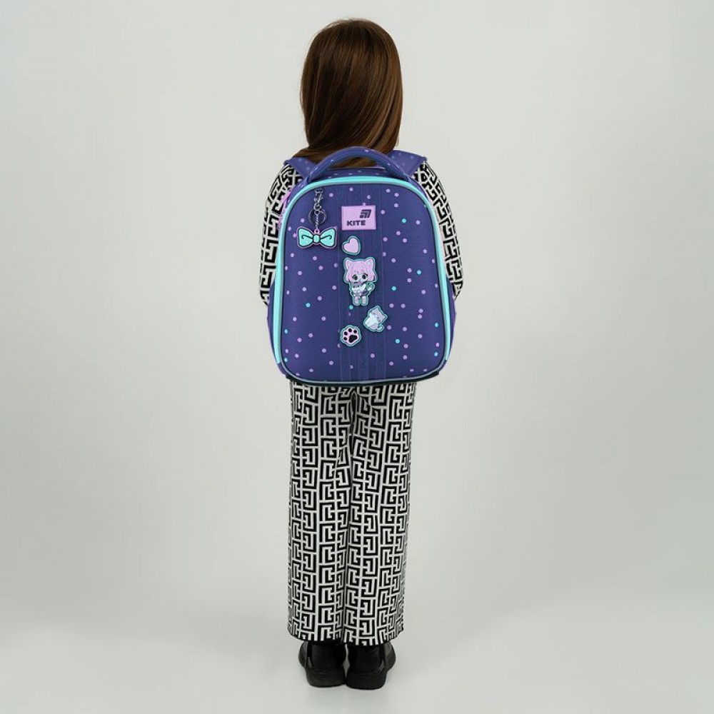 Рюкзак зовні: запатентована ортопедична спинка Ergo Kids; широкі S-подібні лямки; 2 відділення; 2 бічні кишені; світловідбивні елементи; м'яка ущільнена ручка та текстильна петля; знімний нагрудний ремінь; ущільнене дно з захисним покриттям та ніжками; зносостійкі блискавки, надійна фурнітура; Рюкзак всередині: роздільники з фіксуючою резинкою; кишеня для телефона з плюшевою підкладкою; органайзер; знімна ключниця, поле для персональних даних; Декор: гумові бейджі на липучці, гумовий брелок-підвіска на металевому карабіні