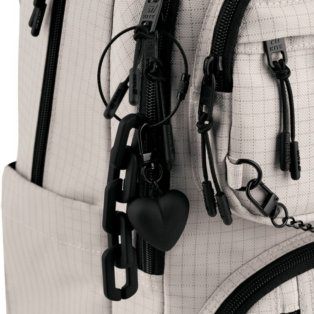 Рюкзак зовні: анатомічна спинка; широкі S-подібні лямки; 2 відділення; 4 передні кишені; 2 бічні кишені; прихована кишеня на спинці; світловідбивні елементи; м'яка ущільнена ручка; ручка-петля; знімний нагрудний ремінь; ущільнене дно; зносостійкі блискавки; надійна фурнітура. Рюкзак всередині: роздільники з фіксуючою резинкою; кишеня для планшета; кишеня для телефона з плюшевою підкладкою; органайзер; знімна ключниця; брендована підкладка. Декор: тканина - матовий ріпстоп; об'ємний друк; металевий ланцюжок на карабінах; брелок-підвіска у формі серця на металевому кільці.