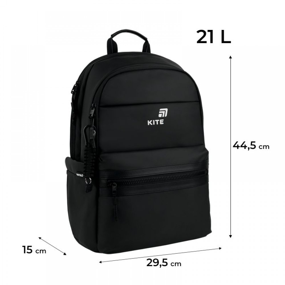 Рюкзак зовні: анатомічна ущільнена спинка; широкі S-подібні лямки; 2 відділення; 1 передня та 2 бічні кишені; ручка-петля; знімний нагрудний ремінь; лямка для кріплення на валізі; світловідбивні елементи; зносостійкі блискавки; надійна фурнітура. Рюкзак всередині: кишеня для ноутбука; кишеня для планшета; кишеня для телефону з плюшевою підкладкою; 1 кишеня на блискавці з сіточкою; органайзер; знімна брендована ключниця; брендована підкладка. Декор: об'ємний друк, брелок-підвіска з комбінованих матеріалів.