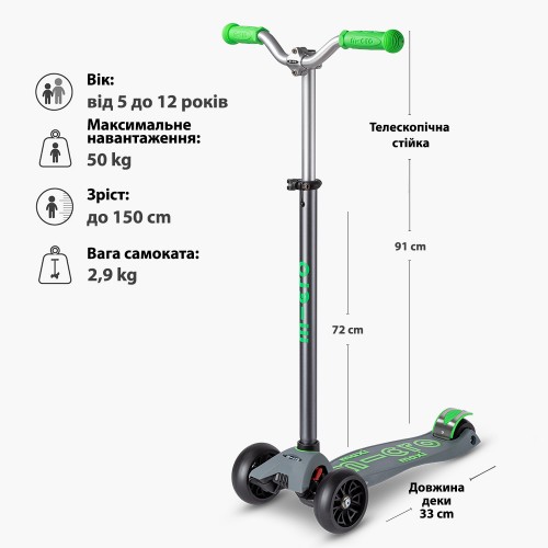 - самокат підходить для дітей дошкільного віку та школярів (від 5 до 12 років) зростом до 150 сm і масою тіла до 50 kg;