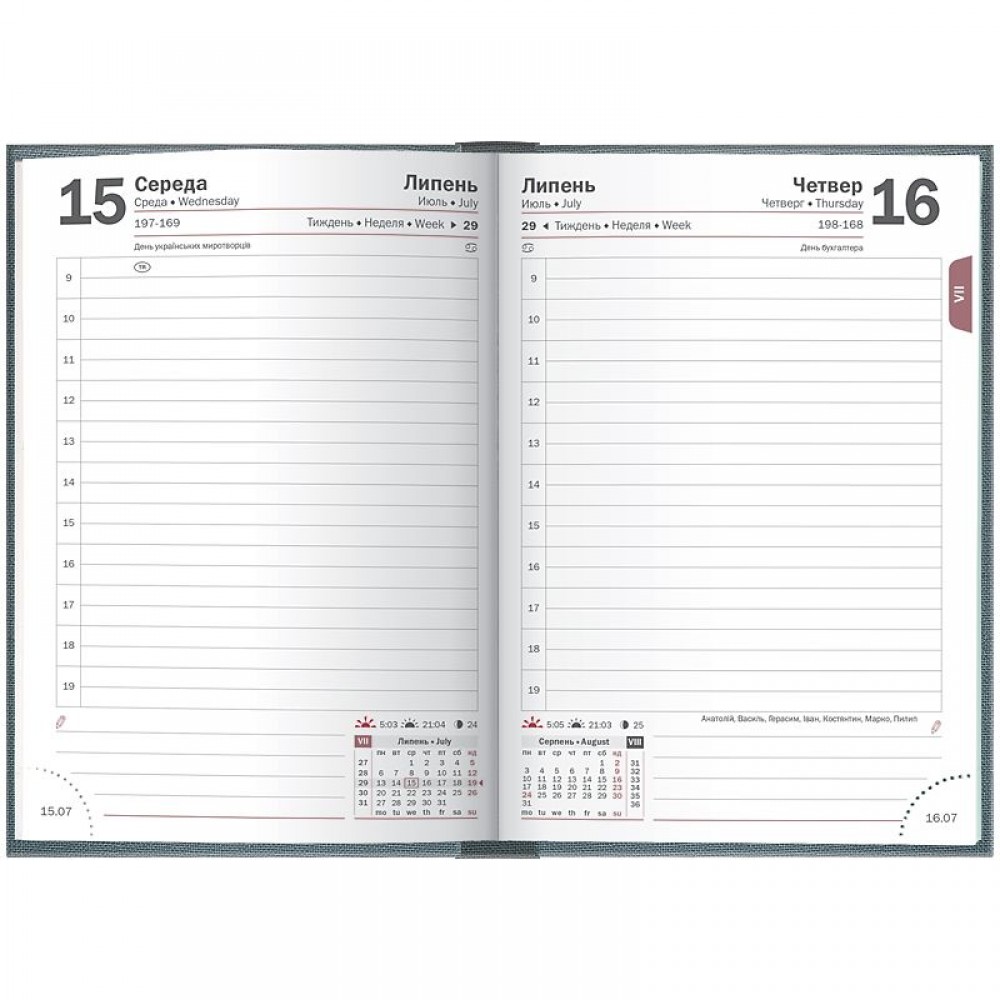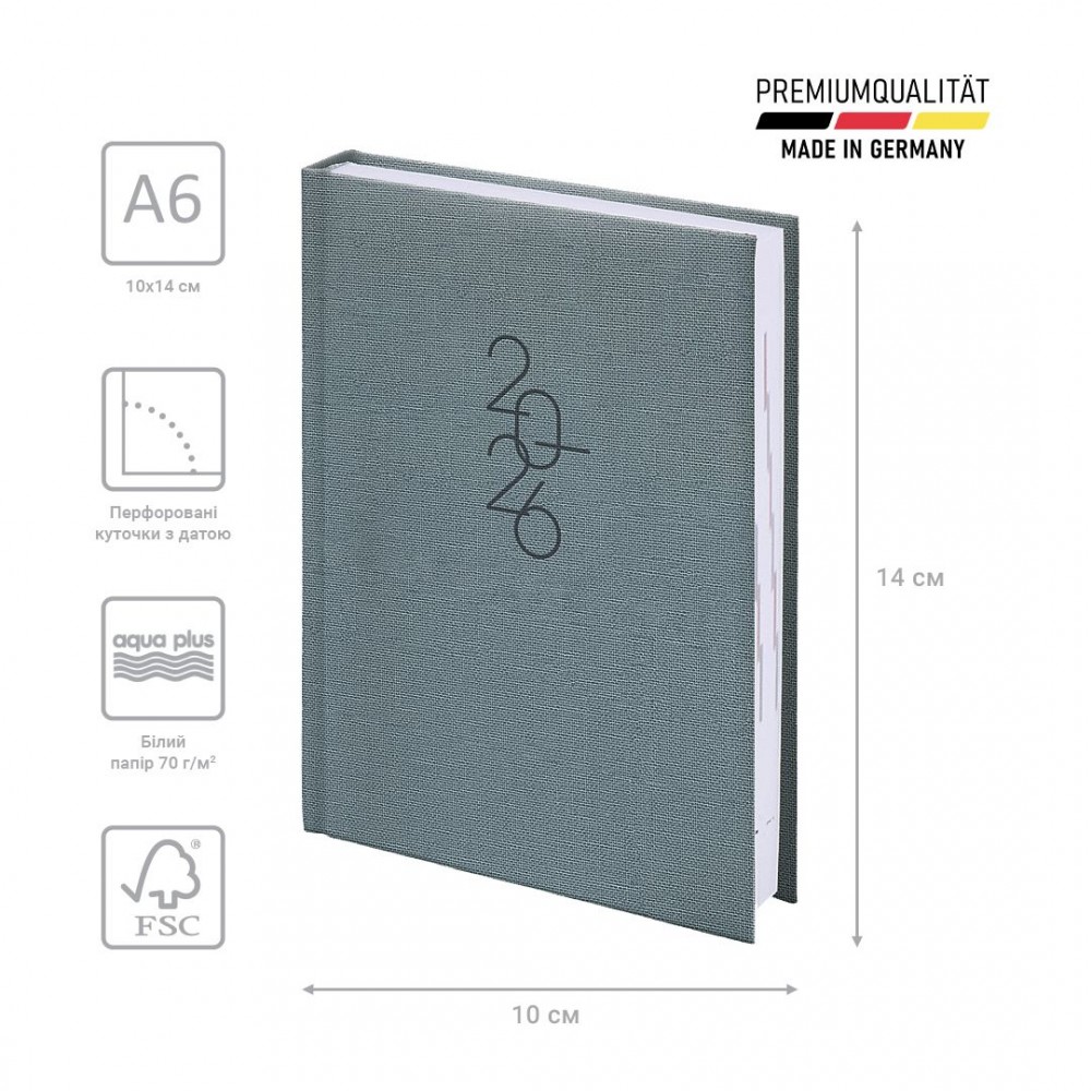 Щоденник датований кишеньковий Brunnen 2026 – компактна модель для активних особистостей. Гармонійне поєднання консервативного внутрішнього блоку та стильної обкладинки. Особливості: Компактний формат А6. Три мови: українська, англійська, німецька. Кремові форзаци. 1 сторінка – 1 день. Субота та неділя на одній сторінці. Організатор з 09:00 до 19:00. Інформаційний блок. Перфоровані датовані куточки. Якісний друк у сірому кольорі. Сторінки загального планування на місяць. Календарі на 2026 і 2027 рр. Білий папір 70 г/м². Відривні сторінки з перфорацією для записів. Обкладинка Linesse. Срібне тиснення.