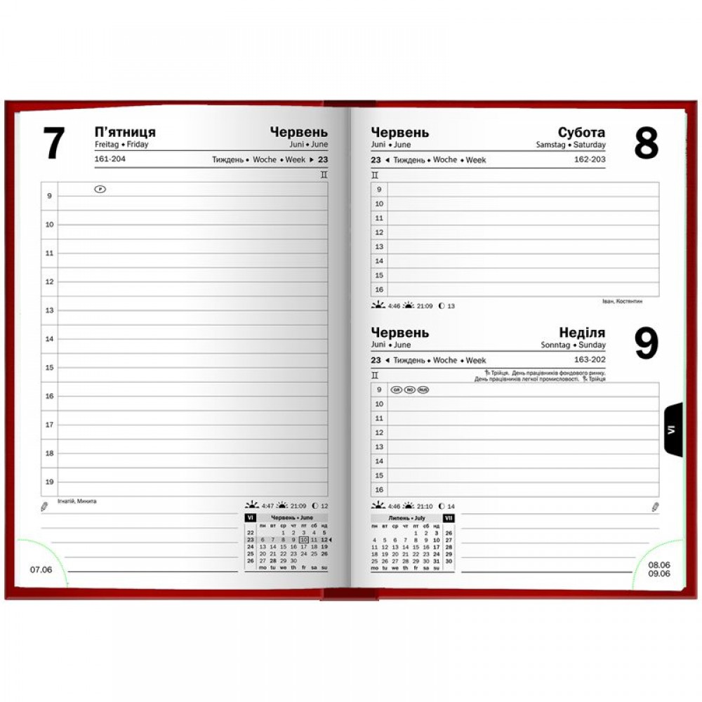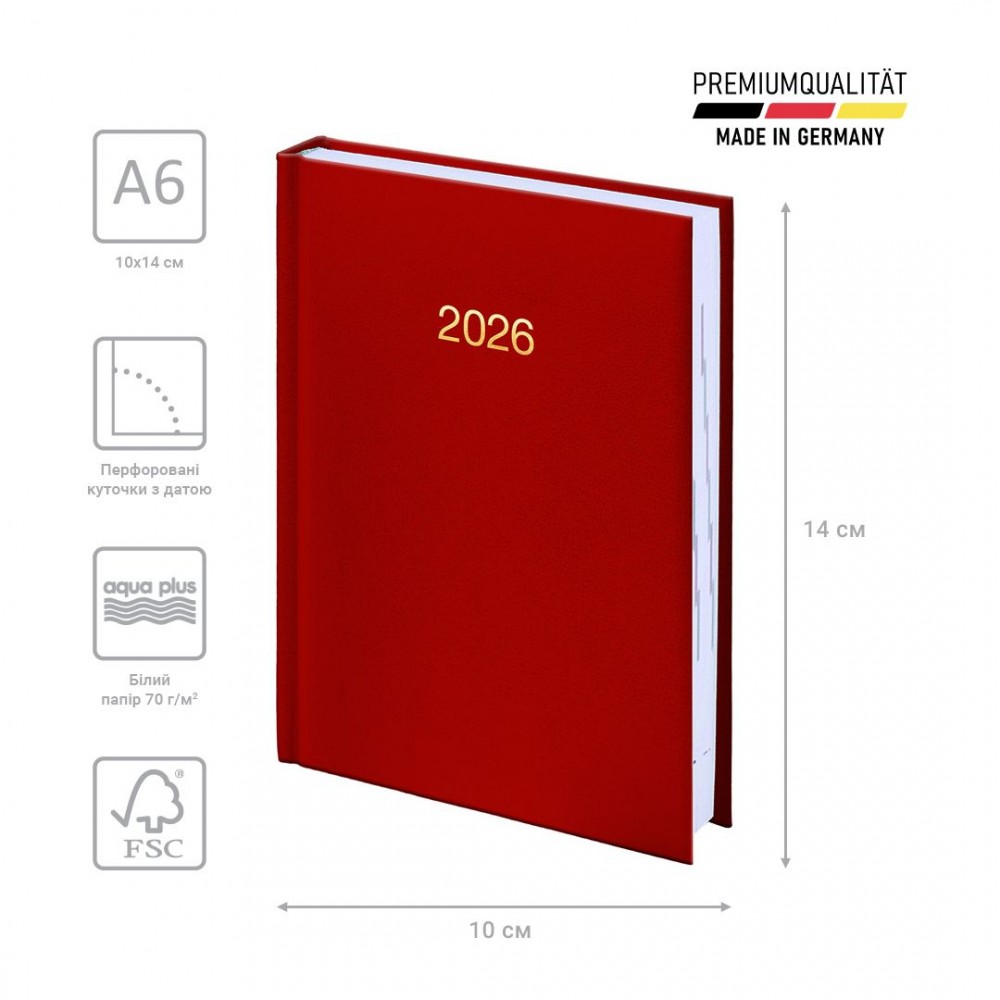 Щоденник датований кишеньковий Brunnen 2026 – компактна модель для активних особистостей. Гармонійне поєднання консервативного внутрішнього блоку та стильної обкладинки. Особливості: Компактний формат А6. Три мови: українська, англійська, німецька. Кремові форзаци. 1 сторінка – 1 день. Субота та неділя на одній сторінці. Організатор з 09:00 до 19:00. Інформаційний блок. Перфоровані датовані куточки. Якісний друк у сірому кольорі. Сторінки загального планування на місяць. Календарі на 2026 і 2027 рр. Білий папір 70 г/м². Відривні сторінки з перфорацією для записів. Обкладинка Miradur. Золоте тиснення.