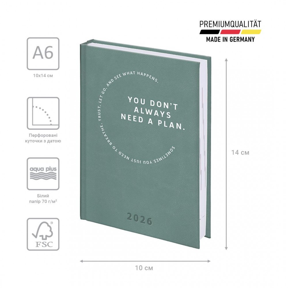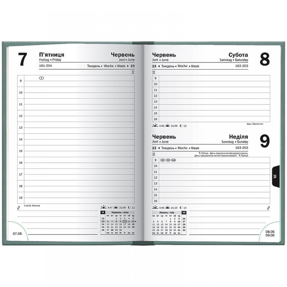 Щоденник датований кишеньковий Brunnen 2026 – компактна модель для активних особистостей. Гармонійне поєднання консервативного внутрішнього блоку та стильної обкладинки. Особливості: Компактний формат А6. Три мови: українська, англійська, німецька. Кремові форзаци. 1 сторінка – 1 день. Субота та неділя на одній сторінці. Організатор з 09:00 до 19:00. Інформаційний блок. Перфоровані датовані куточки. Якісний друк у сірому кольорі. Сторінки загального планування на місяць. Календарі на 2026 і 2027 рр. Білий папір 70 г/м². Відривні сторінки з перфорацією для записів. Обкладинка Torino Trend. Біле тиснення.