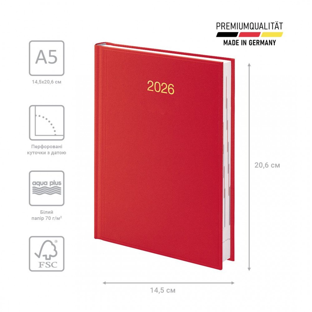 Датований щоденник BRUNNEN 2026 Стандарт — стильна класична модель. Оптимізований простір для записів та зручна навігація. Особливості: Три мови: українська, англійська, німецька. Загальна кількість сторінок — 336. Одна сторінка — один день. Організатор часу з 07:00 до 22:00. Якісний друк у сірому кольорі. 4 сторінки для загального планування на рік. Розширений інформаційний блок. Білий європейський папір 70 г/м2. Закладка-лясе та відривні куточки з датою. Стильна обкладинка Miradur. Золоте тиснення.