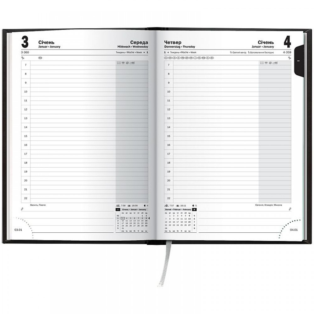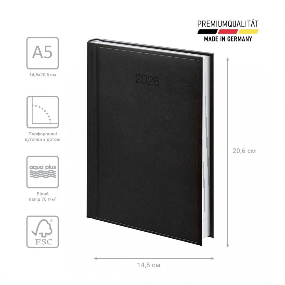 Датований щоденник BRUNNEN 2026 Стандарт — стильна класична модель. Оптимізований простір для записів та зручна навігація. Особливості: Три мови: українська, англійська, німецька. Загальна кількість сторінок — 336. Одна сторінка — один день. Організатор часу з 07:00 до 22:00. Якісний друк у сірому кольорі. 4 сторінки для загального планування на рік. Розширений інформаційний блок. Білий європейський папір 70 г/м2. Закладка-лясе та відривні куточки з датою. Стильна обкладинка Torino. Сліпе тиснення.