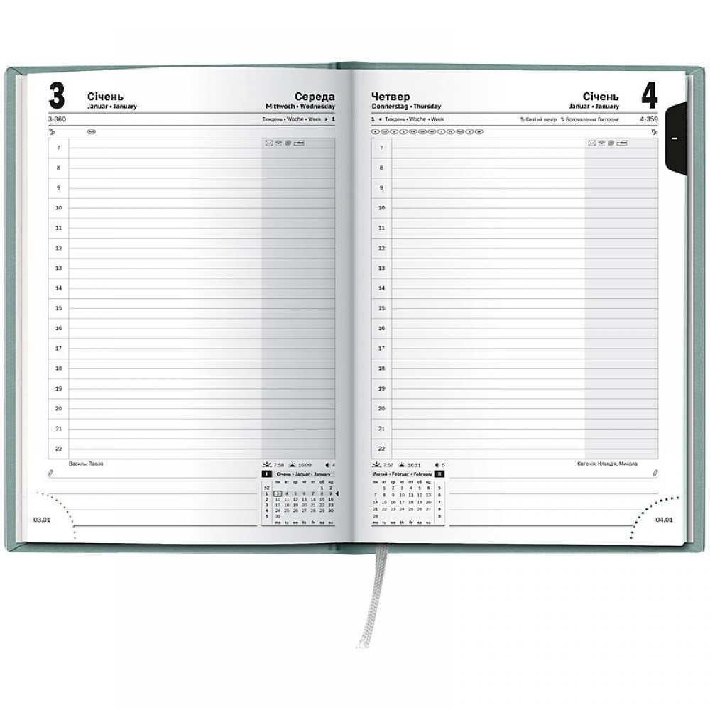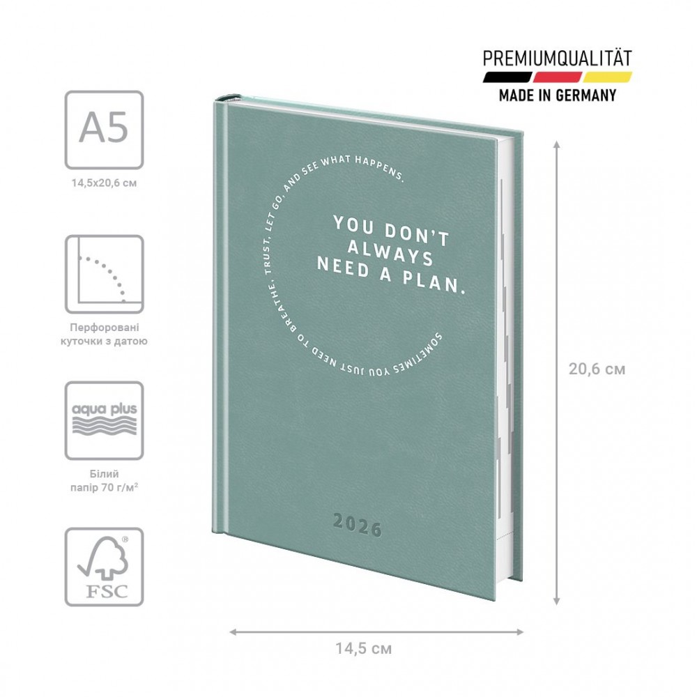 Датований щоденник BRUNNEN 2026 Стандарт — стильна класична модель. Оптимізований простір для записів та зручна навігація. Особливості: Три мови: українська, англійська, німецька. Загальна кількість сторінок — 336. Одна сторінка — один день. Організатор часу з 07:00 до 22:00. Якісний друк у сірому кольорі. 4 сторінки для загального планування на рік. Розширений інформаційний блок. Білий європейський папір 70 г/м2. Закладка-лясе та відривні куточки з датою. Стильна обкладинка Torino Trend. Біле тиснення.