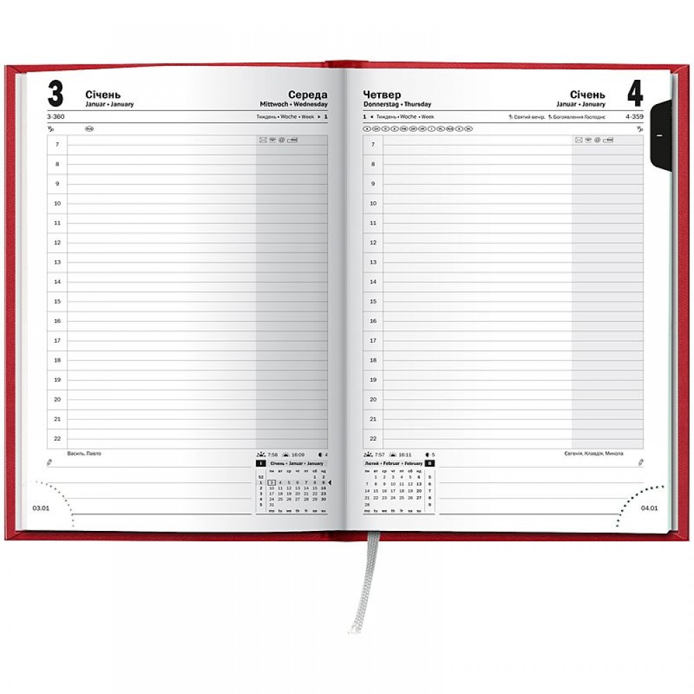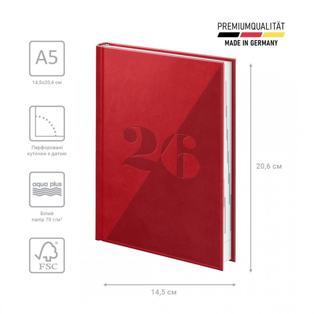 Датований щоденник BRUNNEN 2026 Стандарт — стильна класична модель. Оптимізований простір для записів та зручна навігація. Особливості: Три мови: українська, англійська, німецька. Загальна кількість сторінок — 336. Одна сторінка — один день. Організатор часу з 07:00 до 22:00. Якісний друк у сірому кольорі. 4 сторінки для загального планування на рік. Розширений інформаційний блок. Білий європейський папір 70 г/м2. Закладка-лясе та відривні куточки з датою. Стильна обкладинка Torino Trend. Сліпе тиснення.