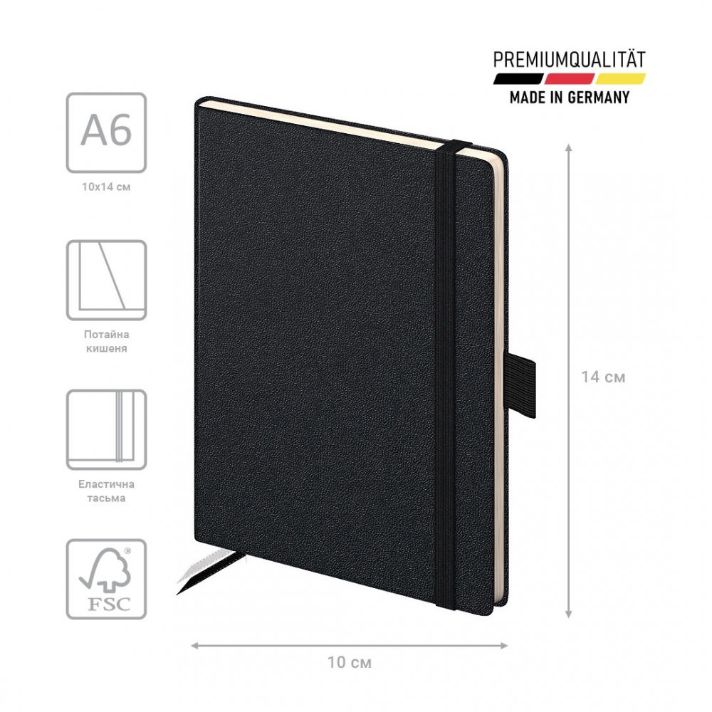Щотижневик 2026 Euro Компаньон Strong чорний створений для тих, хто цінує лаконічність. Бездоганна модель з німецької колекції для європейських країн. Особливості: Розмір: 10*14 см. Датована модель. Гладенький кремовий папір щільністю 80 г/м2. Інформаційний блок — німецькою мовою. 4 мови: англійська, німецька, французька, італійська. Делікатний сірий друк. Чисті незадруковані форзаци. Чорна закладка. Змінна телефонна книга. Фірмова фіксуюча резинка. Потайна кишеня. Петля для ручки.