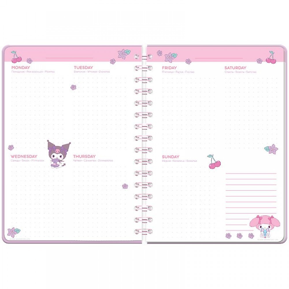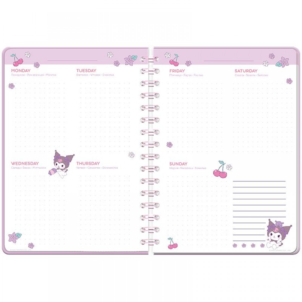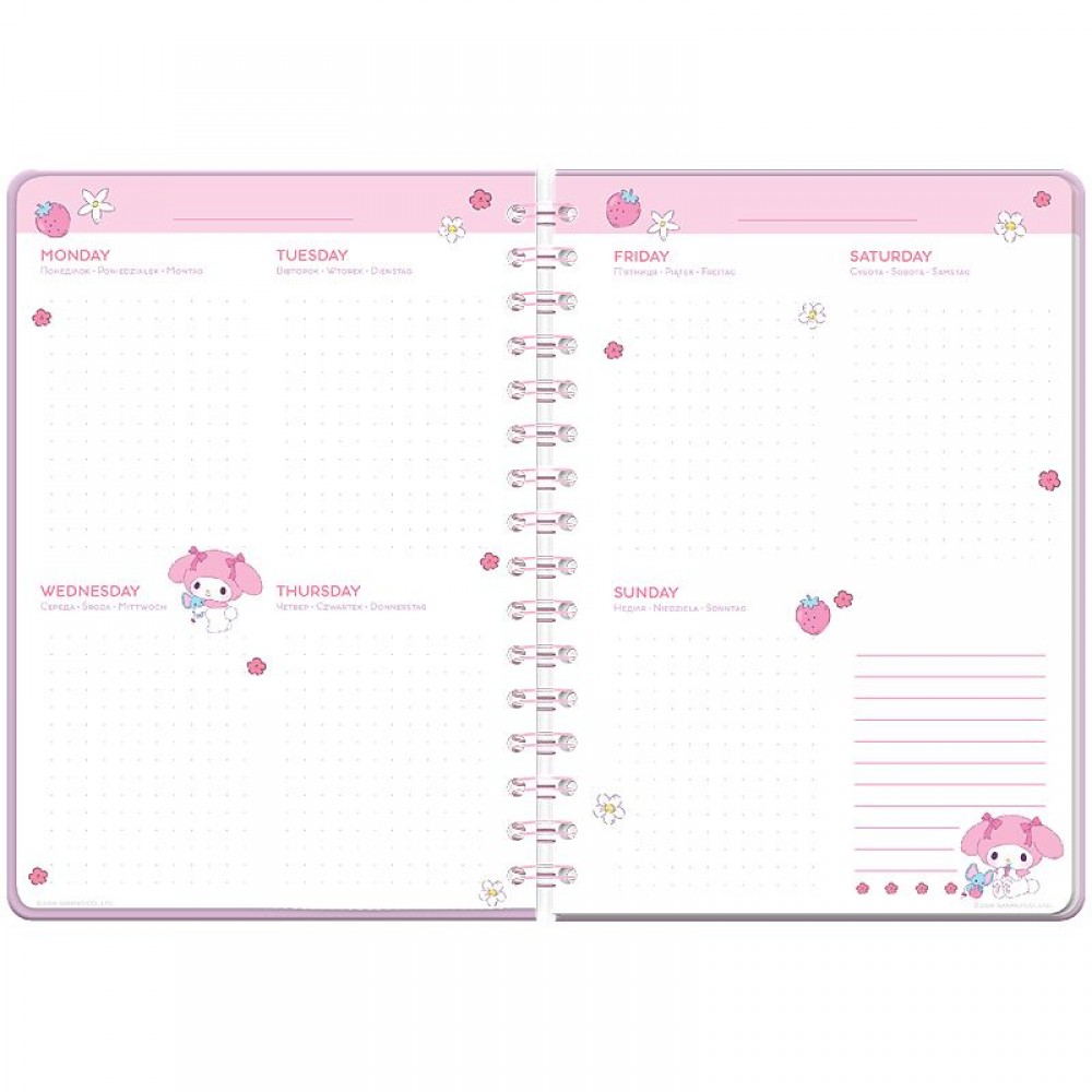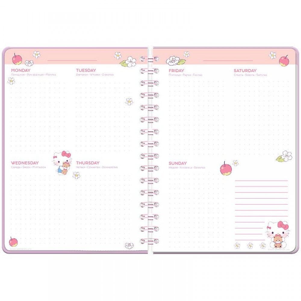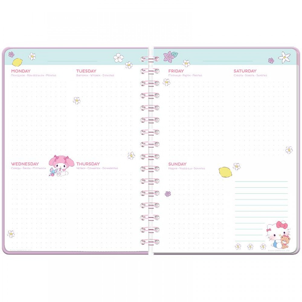 Щоденник-планер на спіралі. Тверда картонна обкладинка з фіксуючою резинкою. Ефект на обкладинці: софт тач покриття та вибірковий уф лак. Всередині: • Розклад на тиждень; • Тиждень на двох сторінках, 5 різних дизайнів розворотів тижня; • 4 кольорові розворити в дизайн ліцензії; • 2 сторінки із стікерами; • Карман для зберігання дрібниць; Внутрішній блок : англійська, українська, польська, німецька. Формат А5, 138 стр., щільність аркушів 80г/м2.