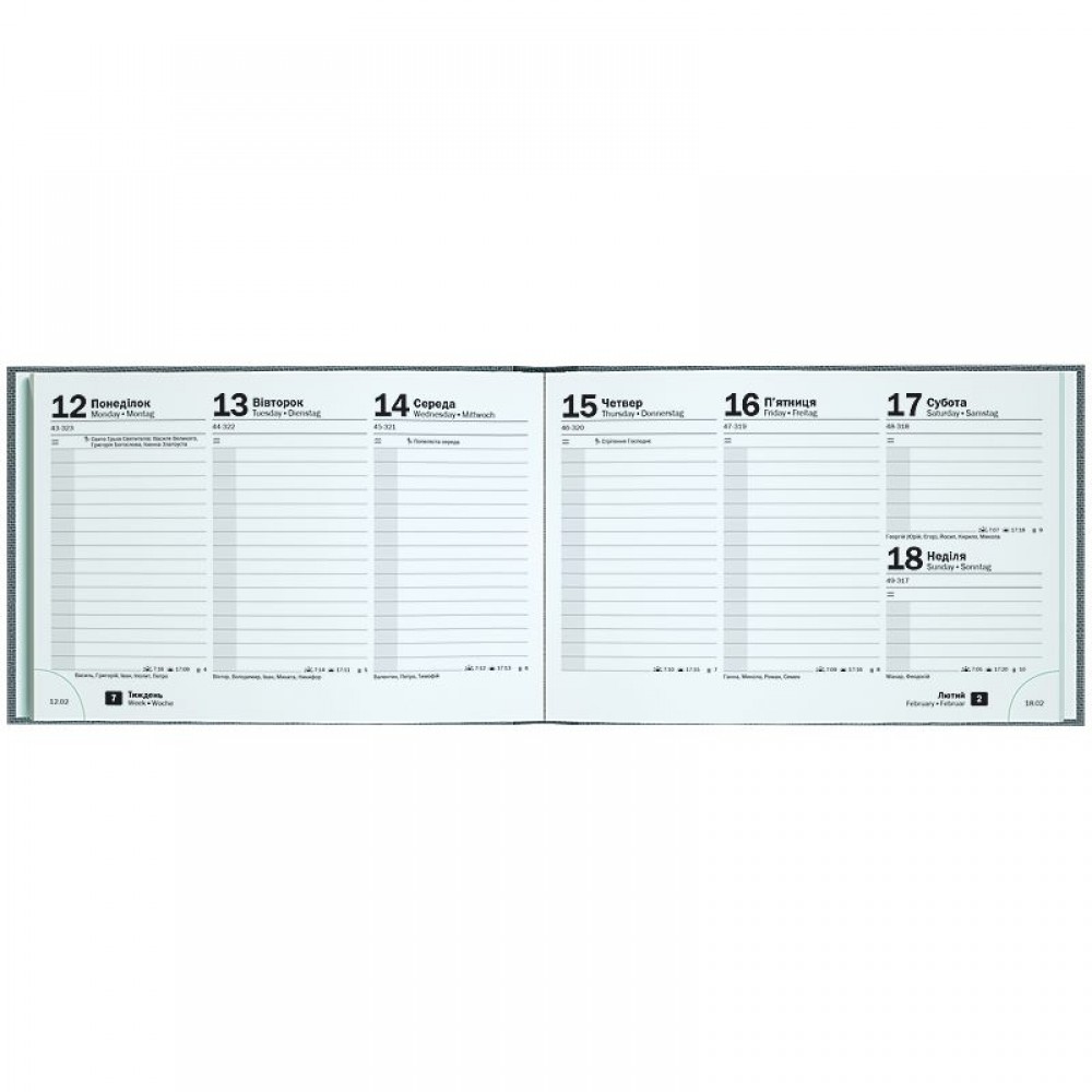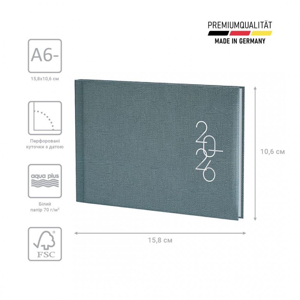 Щотижневик 2026 кишеньковий Brunnen – стильний та компактний інструмент для планування. Особливості: Три мови: українська, англійська, німецька. Кишеньковий формат А6-. Дві сторінки – один тиждень. Інформаційний блок. Перфоровані датовані куточки. Якісний друк у сірому кольорі. Перфоровані сторінки у кінці. Алфавітна записна книга. Вишукані кремові форзаци. Кріплення по вертикалі. Сторінки загального планування на рік. Стильна обкладинка Linesse. Срібне тиснення.