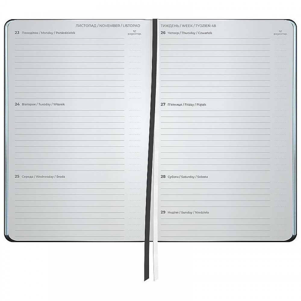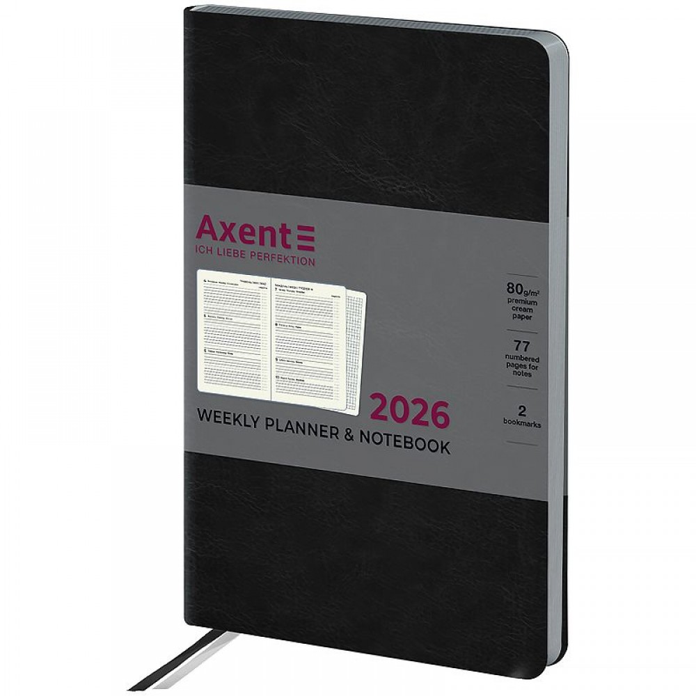 Щотижневик Axent формату А5- із серії City з м'якою обкладинкою та срібним зрізом.. Використовується для щоденних записів, а також ділових та творчих задач. М'яка обкладинка з PU-матеріалу допомагає зберегти акуратний та презентабельний вигляд протягом довгого часу. Якісний кремовий папір щільністю 80 г/м2 добре вбирає чорнило та забезпечує комфортне письмо. Щотижневик поділений на 2 частини – датований блок у лінію для зручного планування справ і додаткові сторінки у клітинку для ведення особистих записів. Внутрішній блок українською мовою. Планер містить календар на 2026-2027 рік, загальний тижневий розклад, інформацію про свята, важливі номери телефонів, часові пояси країн світу, одиниці вимірювання, шкалу температур. Дві різнокольорові закладки-ляссе дозволяють швидко знайти та відкрити потрібні сторінки. Містить 96 аркушів, розмір - 125*195 мм. Кишені на форзаці немає. Немає тасьми на обкладинці та петлі для ручки.