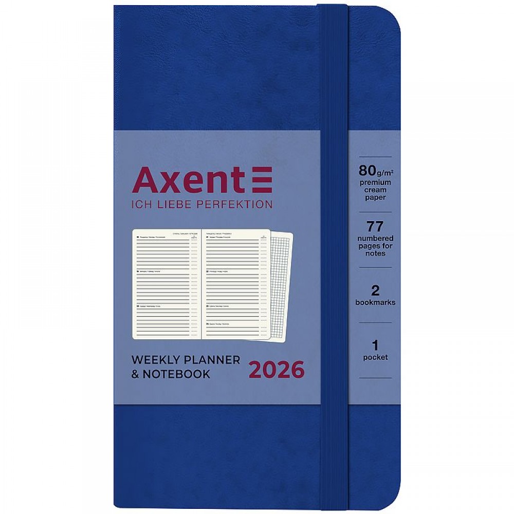 Кишеньковий щотижневик Axent із серії Strong в твердій обкладинці. Використовується для щоденних записів, а також ділових та творчих завдань. Тверда обкладинка з вінілу допомагає зберегти акуратний та презентабельний вигляд протягом довгого часу. Якісний кремовий папір щільністю 80 г/м2 добре вбирає чорнило та забезпечує комфортне письмо. Зручно робити записи, креслити та малювати. Щотижневик поділений на 2 частини – датований блок у лінію для зручного планування справ і додаткові сторінки у клітинку для ведення особистих записів. Внутрішній блок українською мовою. Планер містить календар на 2026-2027 рік, загальний тижневий розклад, інформацію про свята, важливі номери телефонів, часові пояси країн світу, одиниці вимірювання, шкалу температур. Дві різнокольорові закладки-ляссе дозволяють швидко знайти та відкрити потрібні сторінки. Кишеня на форзаці. Містить 96 аркушів, розмір - 90*150 мм.