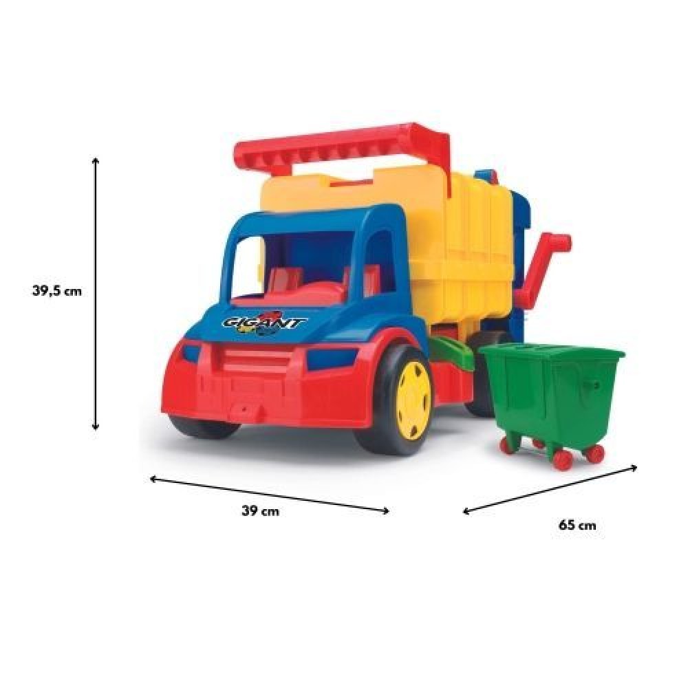 Сміттєвоз Гігант - це велика, міцна машина довжиною 65 см. У комплект із сміттєвозом входить також сміттєвий бак з відкидною кришкою. Бак встановлюється на спеціальну підніжку позаду машини і за допомогою підйомника, його вміст перекидається усередину вантажного бака через кришку, яка відкривається. Рухомі елементи, міцна конструкція, велика вантажопідйомність роблять іграшку надзвичайно цікавою для кожного малюка. Всі елементи виготовлені із високоякісного нетоксичного матеріалу, стійкого до погодних умов, завдяки чому машиною можна гратись цілий рік як вдома так і у дворі. Ігри сміттєвозом створюють додаткові можливості для рухової активності, підтримують моторний розвиток дитини, а також розвивають його уяву і креативність. Окрім цього іграшка вчить дітей дбати про чистоту навколишнього середовища. великий розмір (65 см) і вантажопідйомність (50 кг) рухомі елементи виготовлена з високоякісного нетоксичного, міцного матеріалу, стійкого до атмосферних умов служить для перевезення різних предметів чи іграшок можна гратись в домі і у дворі привчає дитину до чистоти і порядку для дітей від 1 року