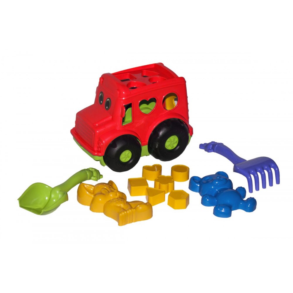 Машинка-сортер "Бусик" з великим піщаним набором. Набір включає в себе: лопатку, грабельки, дві пасочки, фігурки для сортера (6 штук). З цим набором дитина зможе як грати в піску так і використовувати автобус як сортера, тренуючи уяву, логіку і дрібну моторику.