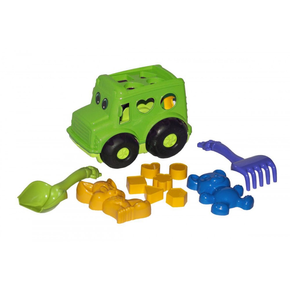 Машинка-сортер "Бусик" з великим піщаним набором. Набір включає в себе: лопатку, грабельки, дві пасочки, фігурки для сортера (6 штук). З цим набором дитина зможе як грати в піску так і використовувати автобус як сортера, тренуючи уяву, логіку і дрібну моторику