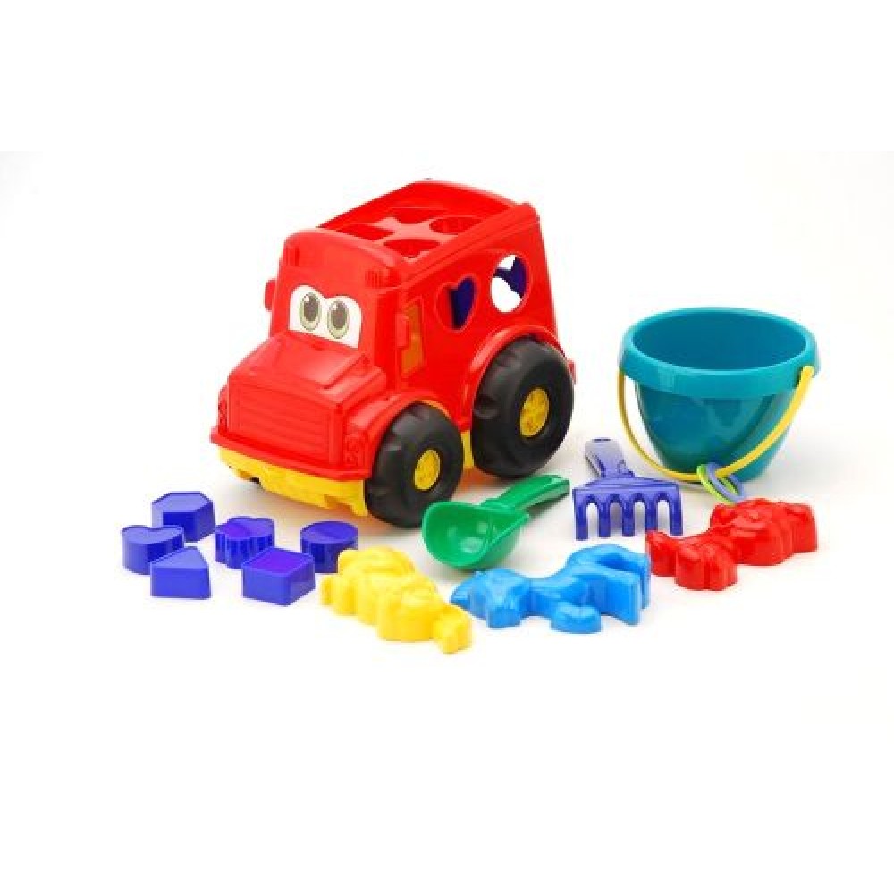 Машинка-сортер "Бусик" з великим піщаним набором. Набір включає в себе: відерце, лопатку, грабельки, три пасочки в формі транспорту або звіряток, фігурки для сортера. З цим набором дитина зможе як грати в піску так і використовувати автобус як сортера, тренуючи уяву, логіку і дрібну моторику.