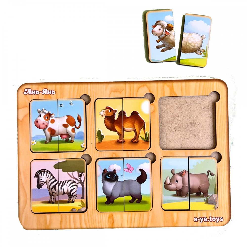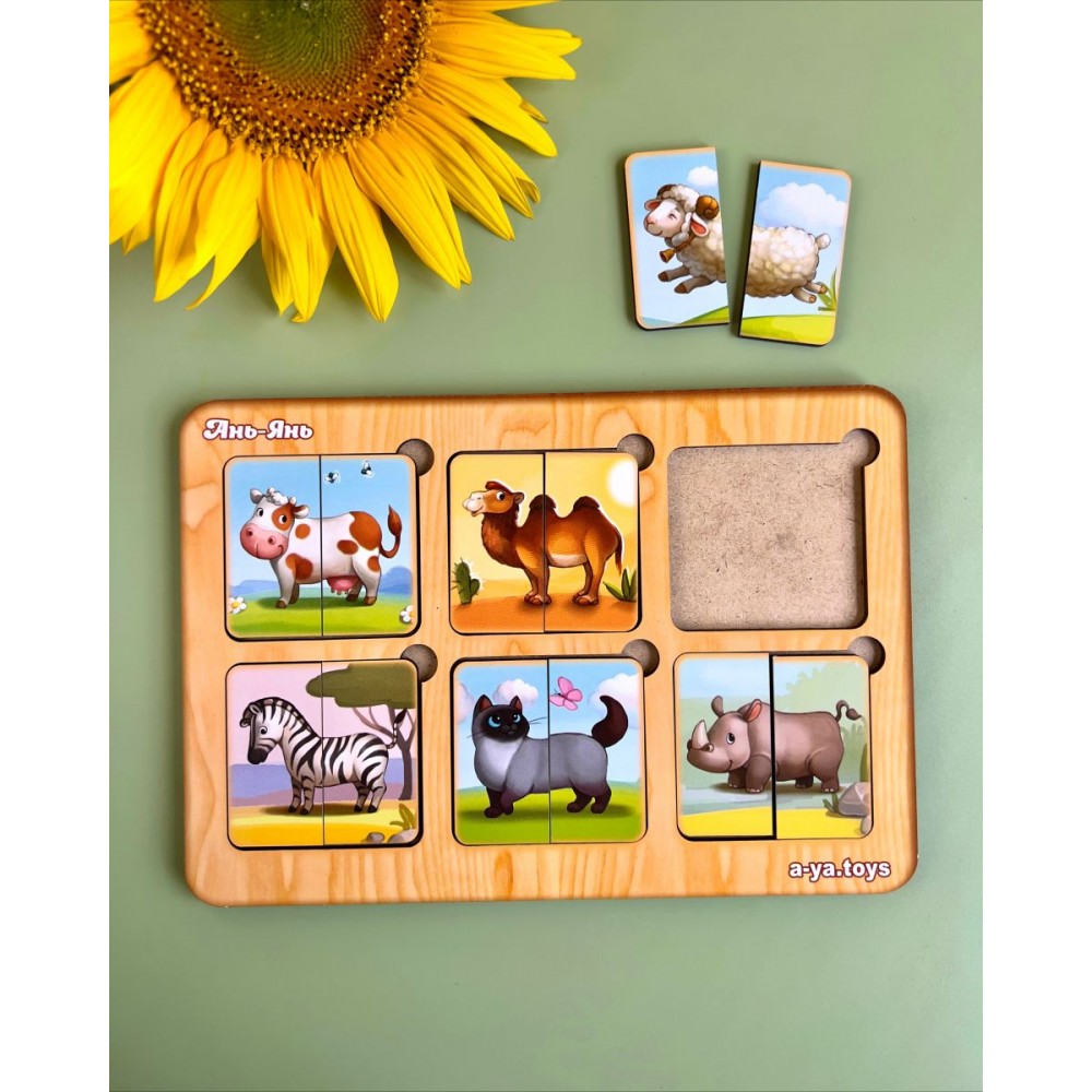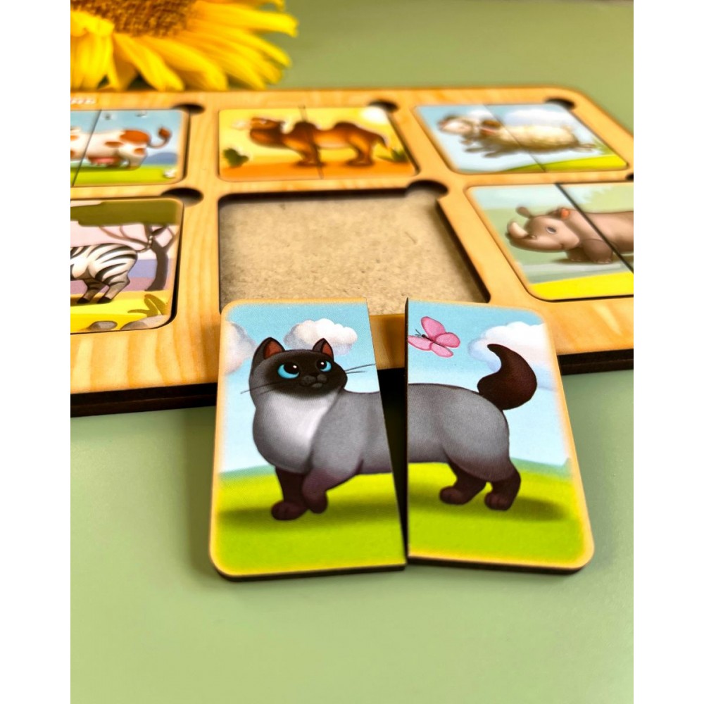 Розвиваюча гра з картинками тварин, у наборі 6 картинок. Потрібно підібрати дві правильні половинки картинки, щоб зібрати готову тварину, або поєднувати дві різні половинки, щоб створено щось нове. Гра - чудовий помічник у вивченні фігур, рахунки та кольорів.