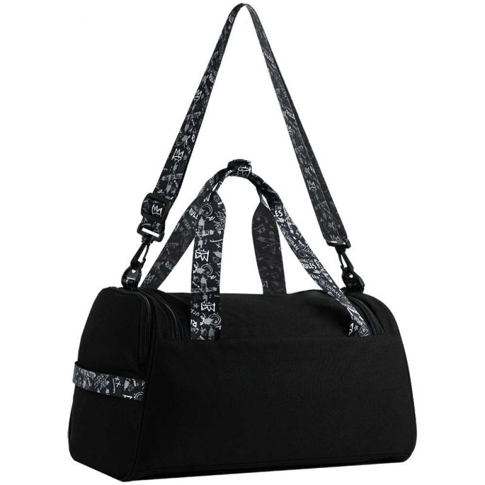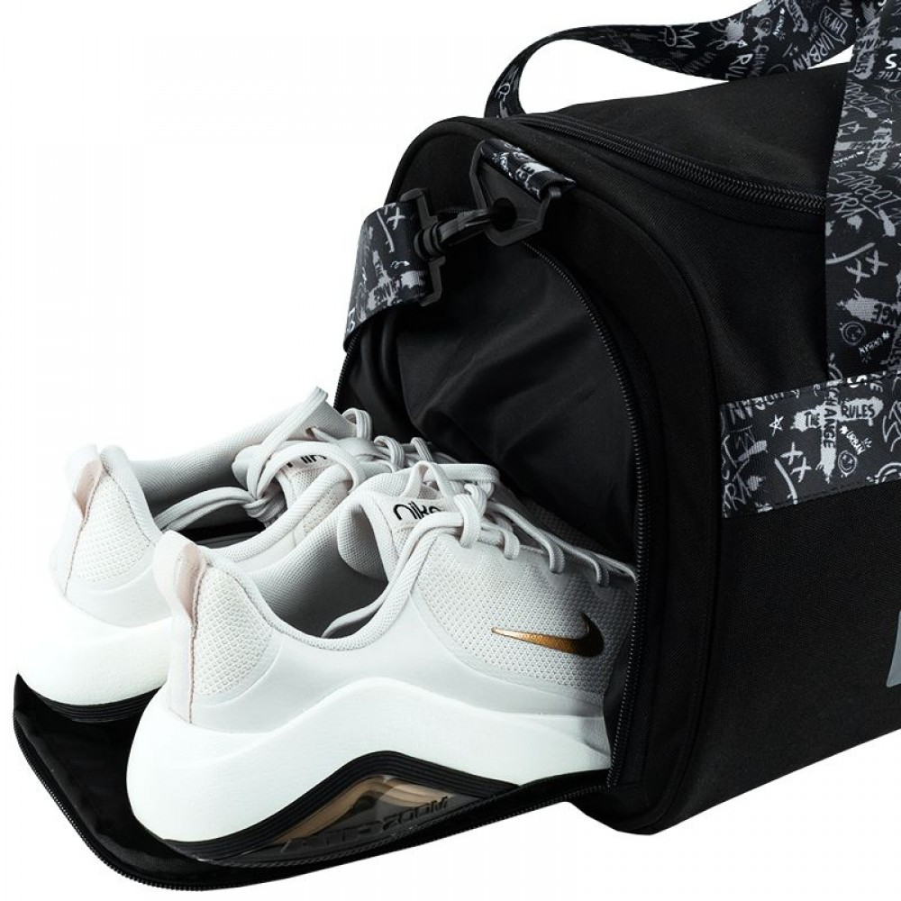 Сумка зовні: 2 відділення: 1 основне та відділення для взуття; 2 зовнішні кишені; має текстильні ручки та довгий регульований ремінець; ущільнене дно; зносостійкі блискавки, надійна фурнітура. Сумка всередині: 1 внутрішня кишеня; брендована підкладка. Декор: об'ємний друк, задрукована тасьма