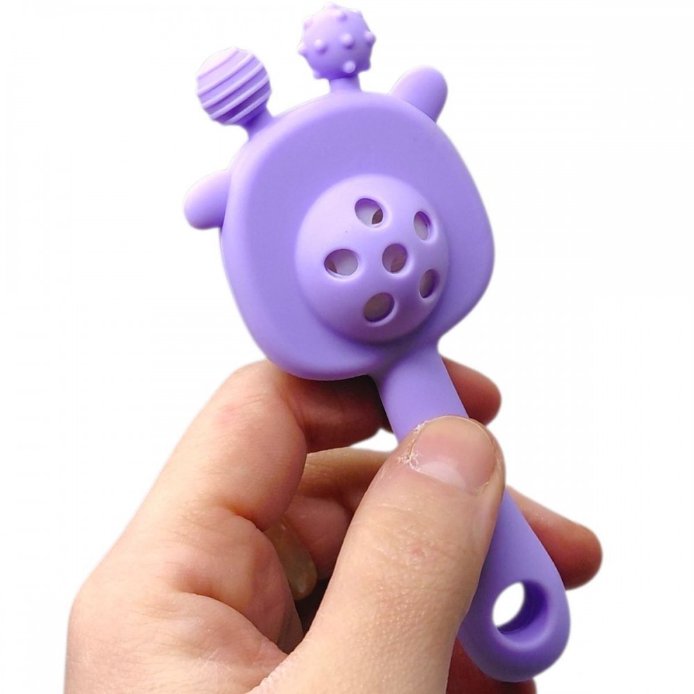 Прорізувач-брязкальце у формі жирафа створений спеціально для дітей раннього віку. Завдяки продуманій формі та зручній ручці малюк легко утримує іграшку самостійно. Рельєфні виступи на верхній частині допомагають м’яко масажувати ясна в період прорізування зубів.