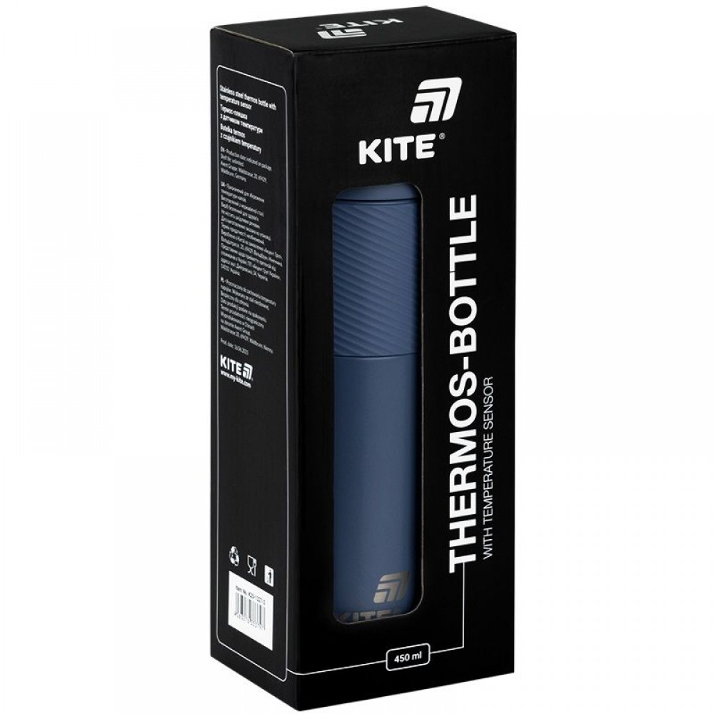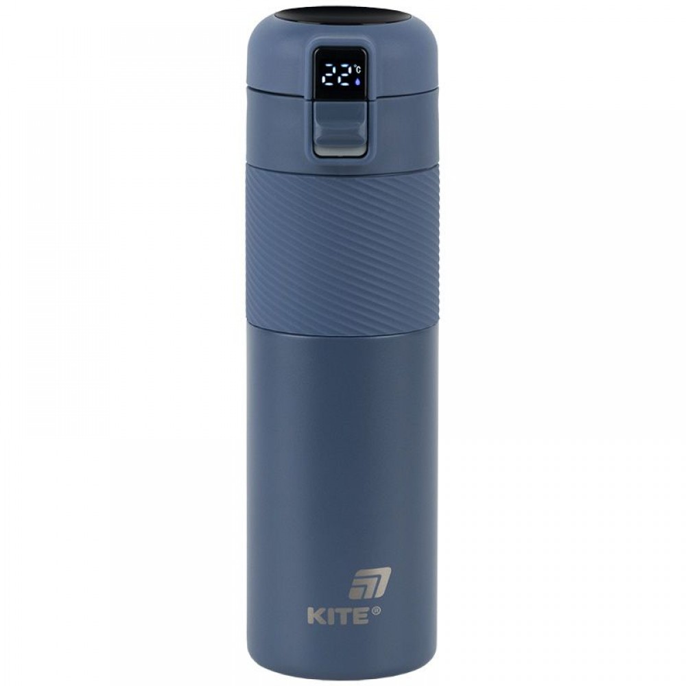 Термос із термодатчиком Kite, 450 мл-сучасний аксесуар для щоденних потреб та активного відпочинку. Цифровий термодатчик на кришці – завжди точна температура напою. Кришка з кнопкою – швидке відкривання та герметичне закриття. Внутрішня колба з нержавіючої сталі AISI 304 — безпечна та довговічна. Прогумована вставка на корпусі