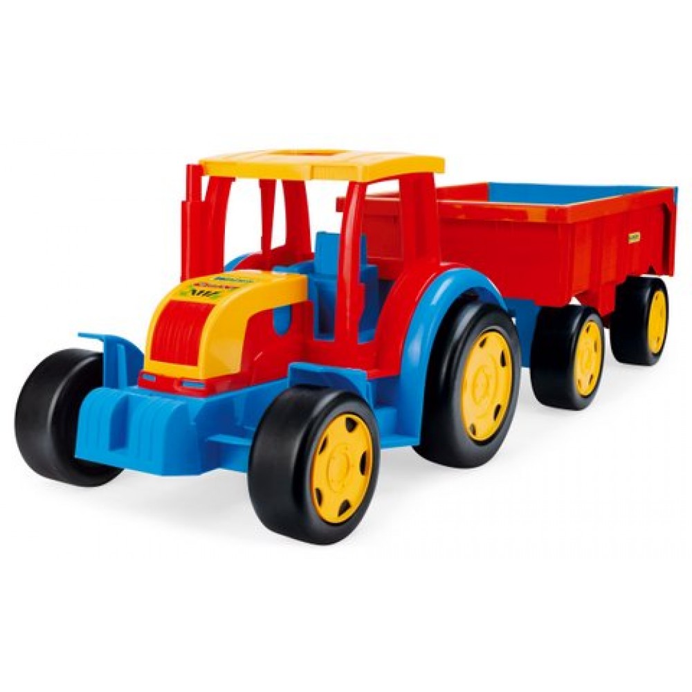 Пластиковий трактор "Гігант" із причепом. Довжина іграшки 102 см. Конструкція міцна з високою вантажністю: трактор – до 100 кг, причіп – до 60 кг. Цю машинку дитина може не просто возити, а й сама кататися на ній (самостійно, відштовхуючись ніжками, або її може везти хтось із батьків. Причіп можна комбінувати з іншими машинами серії "Гігант". Для дітей від 1 року