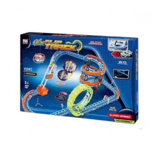 Інтернет-магазин eToys пропонує вашій увазі товар "Трек 69 елементів, машинка із вбудованим акумулятором, підсвічування, світиться у темряві, трюки, муляжі оточення, в коробці" за ціною 1 286 грн..