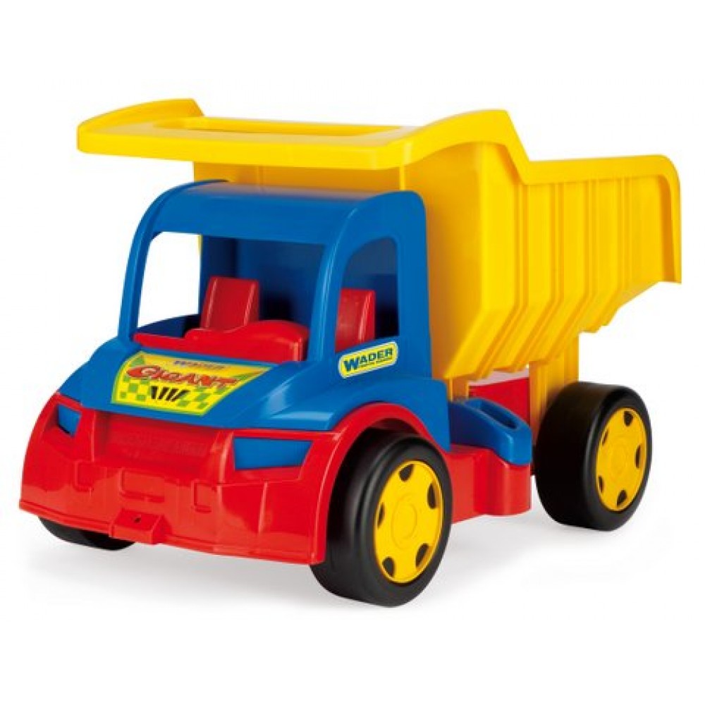 Вантажівка "Гігант". Великі габарити і вантажопідйомність (150 кг). Цю машинку можна не тільки возити, а й кататися на ній самому. Кузов вантажівки можна відкидати, а положення кузова - фіксувати спеціальним фіксатором.