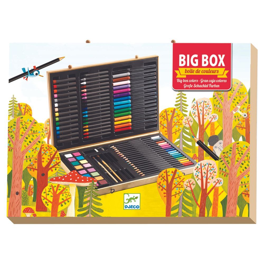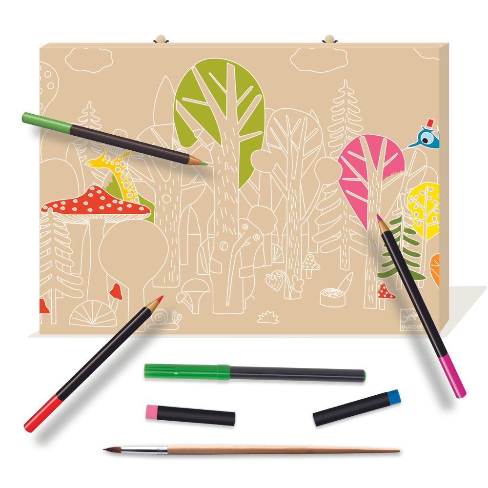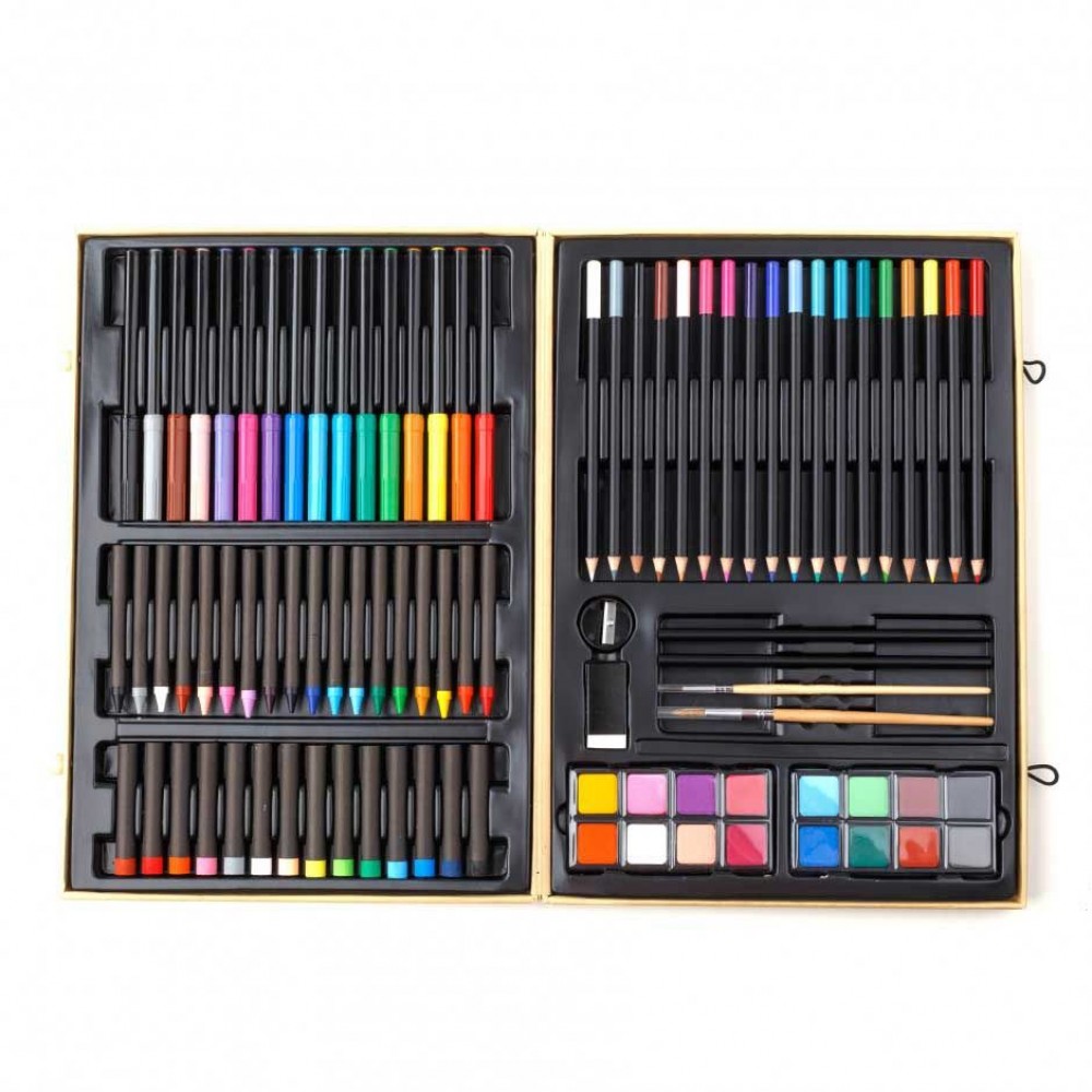 Великий набір для малювання це красиво оформлений дерев'яний ящик, який можна прикрасити. Набір включає все, що потрібно маленькому художнику. Він буде приголомшливим і практичним подарунком, який буде стимулювати дитину до творчості. У наборі: 18 кольорових олівців, 16 фломастерів, 18 крейди-пастелі, 14 акварельних фарб, 2 пензлика, 2 олівця для малювання, 1 стругачка і 1 ластик.