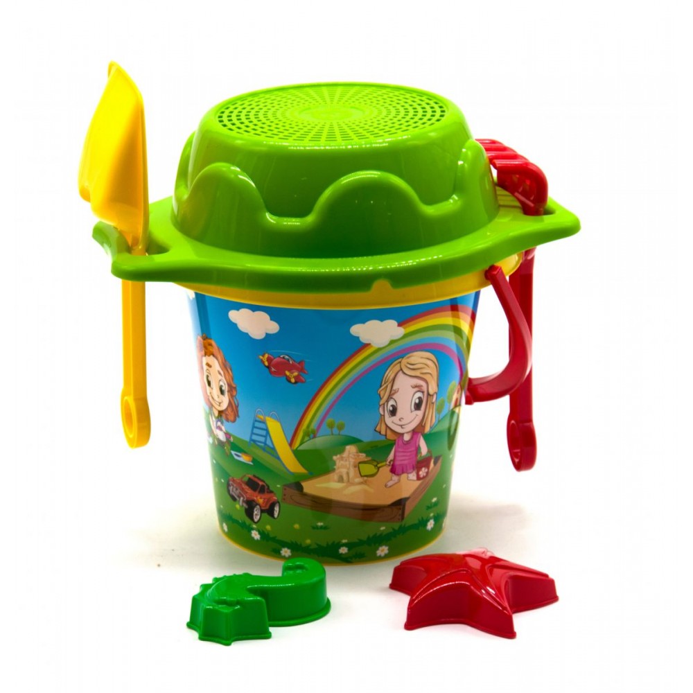 У набір для гри в піску входять: відро (23 х 21 х 18 см), сито (27 х 22 х 7,5 см), лопатка (22 см), грабельки (19 см) і 2 формочки.