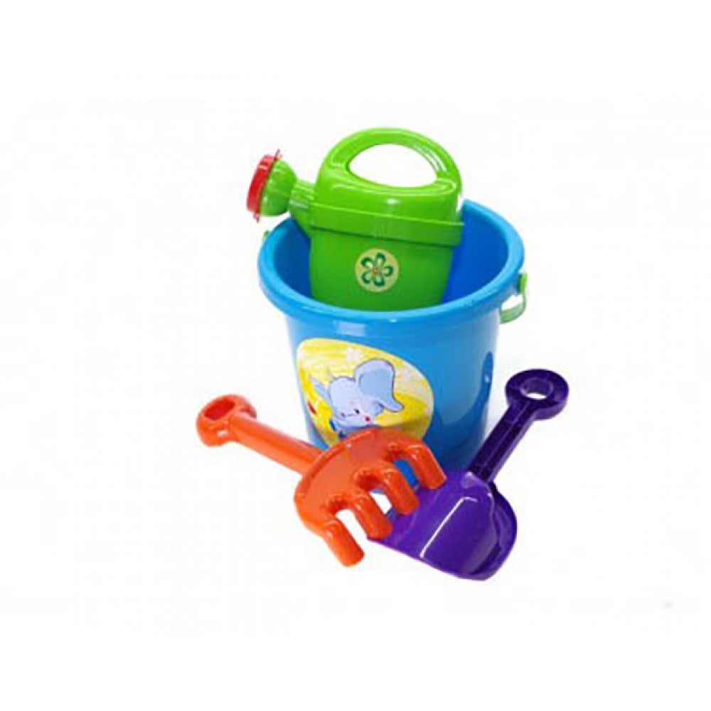 Пісочний набір №1. Підходить для гри вдома, на вулиці, в саду і на пляжі. У комплекті: відро (17 х 17 х 15 см), лійка, граблі та лопатка (20 см).
