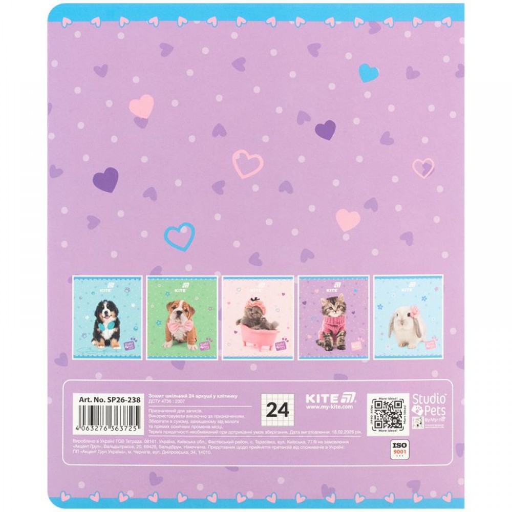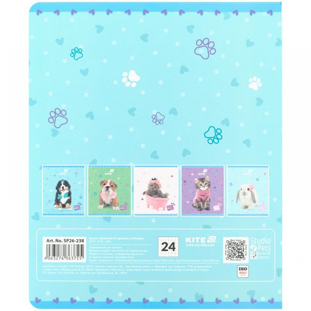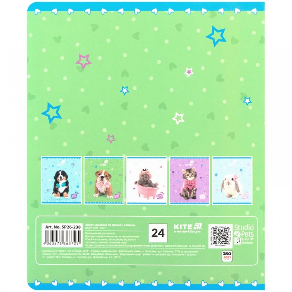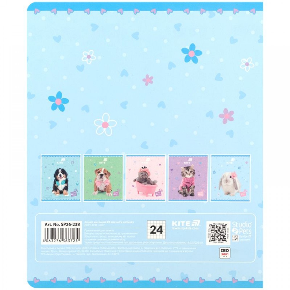 Зошит шкільний на скобі Kite має 24 аркуші, представлений у зручному форматі А5. Аркуші в зошиті зроблені зі щільного паперу, розлініяні в клітинку. Виріб представлено в ущільненій кольоровій обкладинці в 5 дизайнах. Ефект на обкладинці: софт тач ламінація та УФ лак. Кольорова задруківка форзаца, подвійна обкладинка.